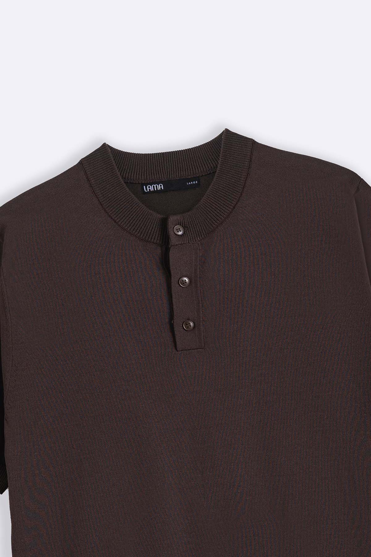 Design details: Short sleeved crew neck henley. Ribbed neckline, sleeve
