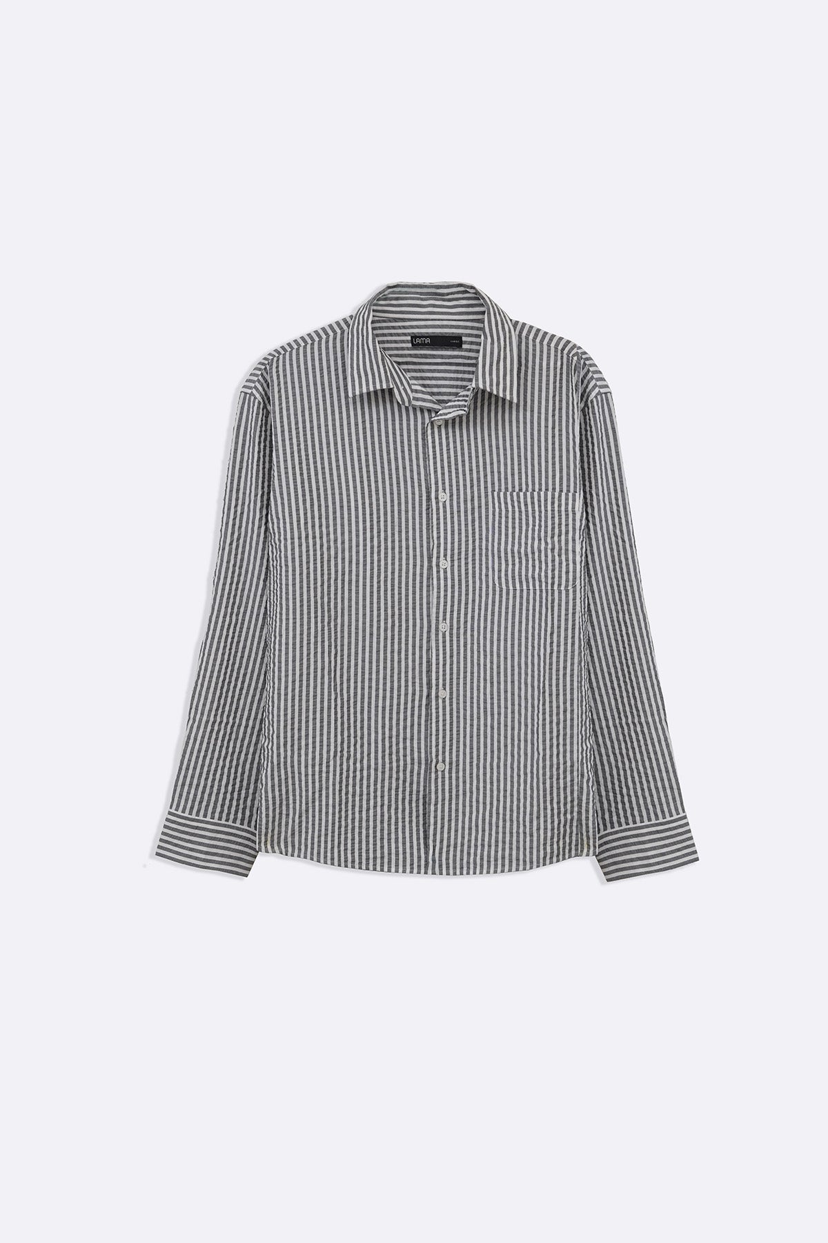 Design details: Striped seersucker button down shirt with a chest patch pocket, collar and full sleeves with cuffs.
