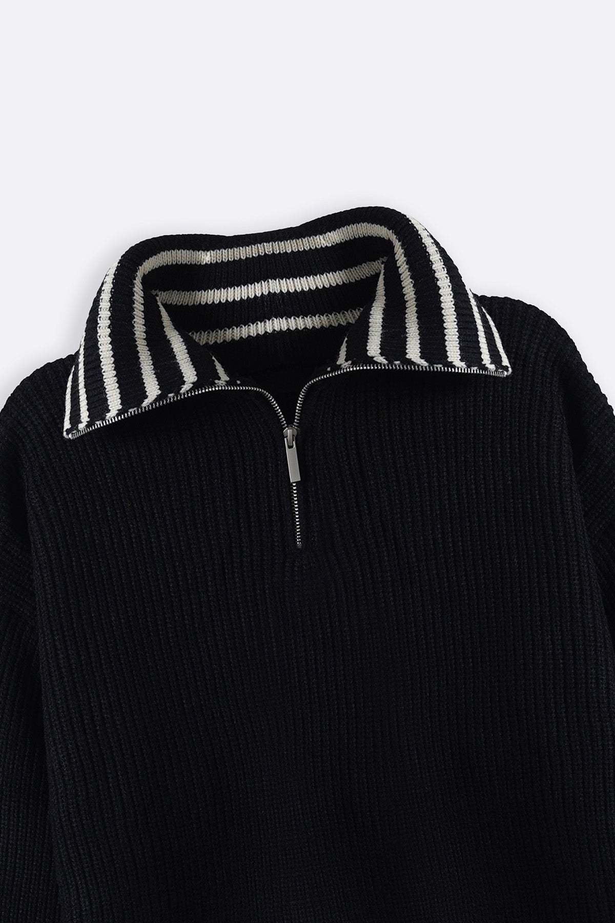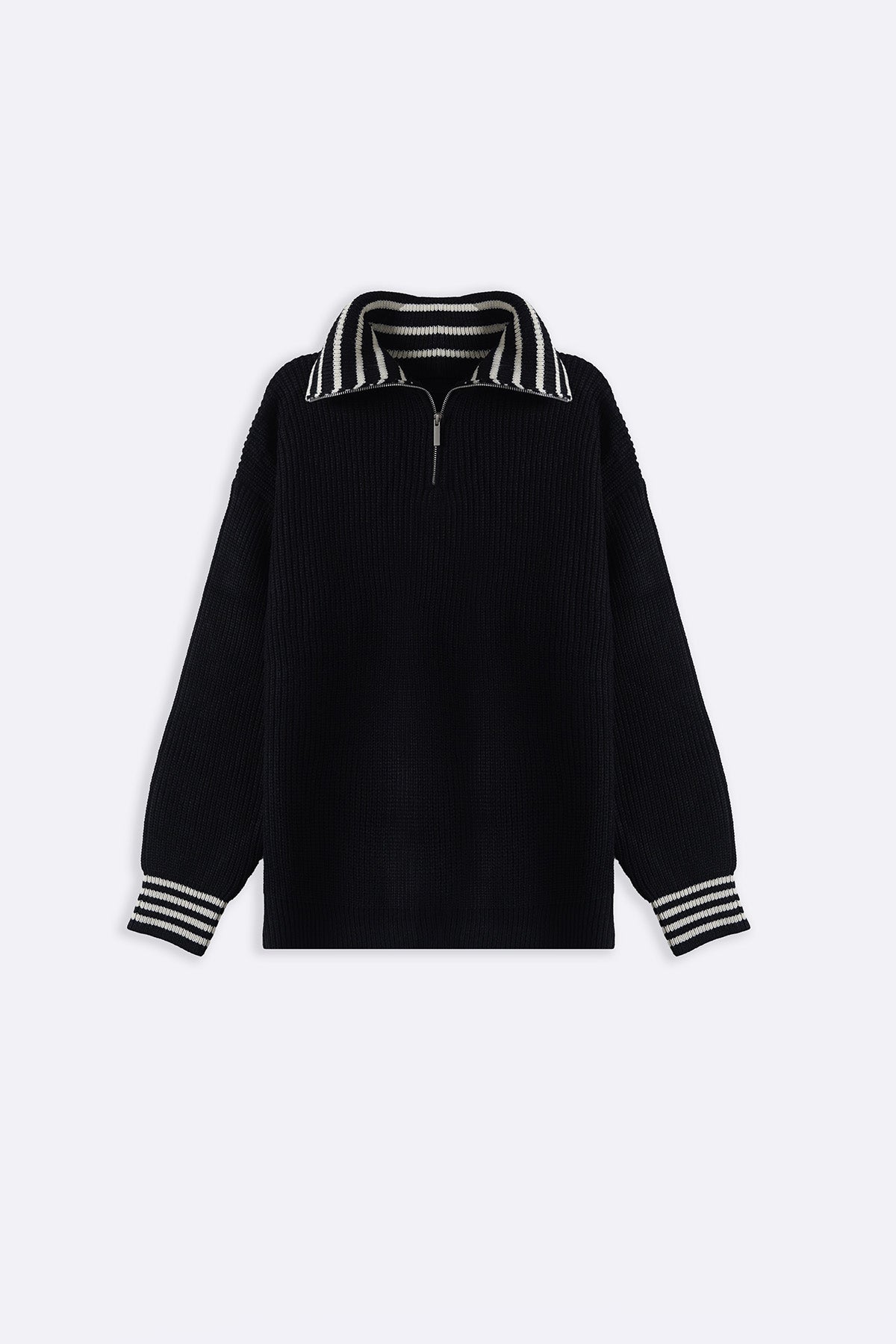 Design details: Mock-neck pullover with quarter zip and design details on cuff and neck.