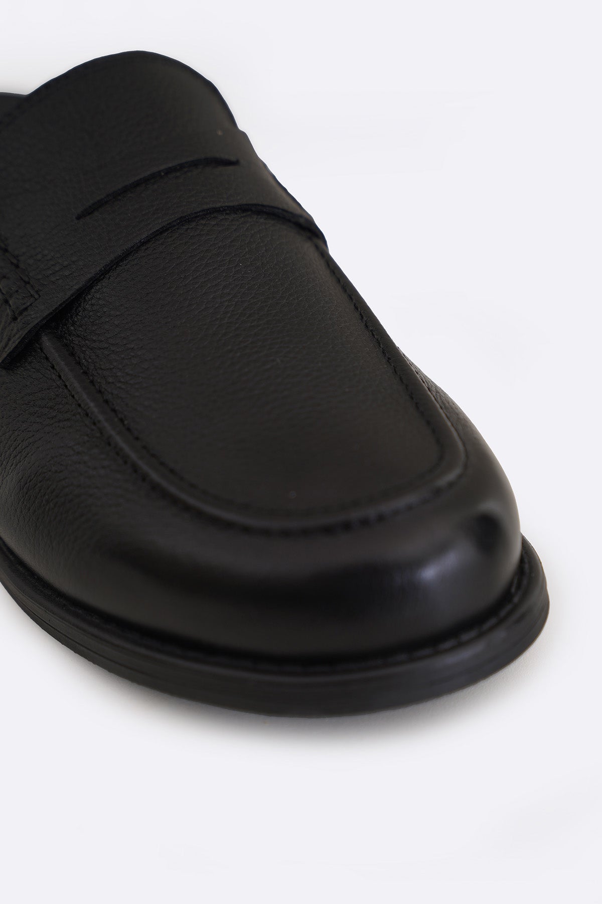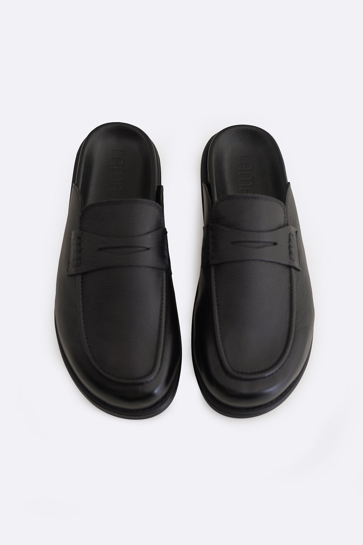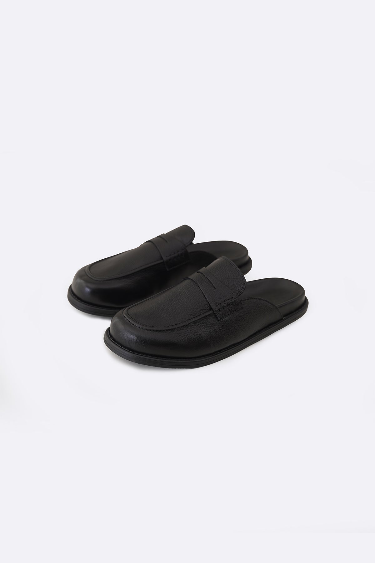 100% genuine grain leather slip-on mules with soft footbed, stitching details on upper and classic leather tie.