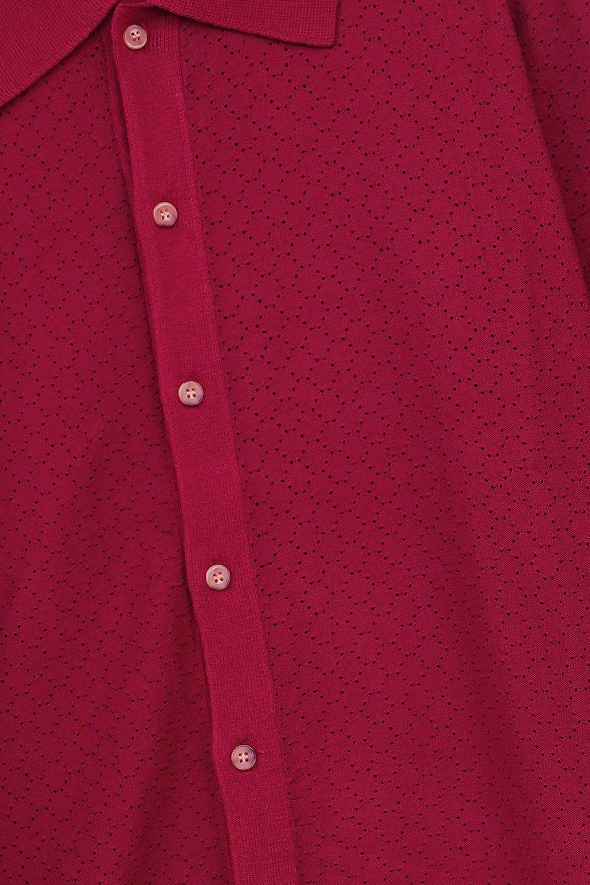 Design details: A button-down polo shirt with short sleeves, ribbed trims, and pointelle knit detailing.