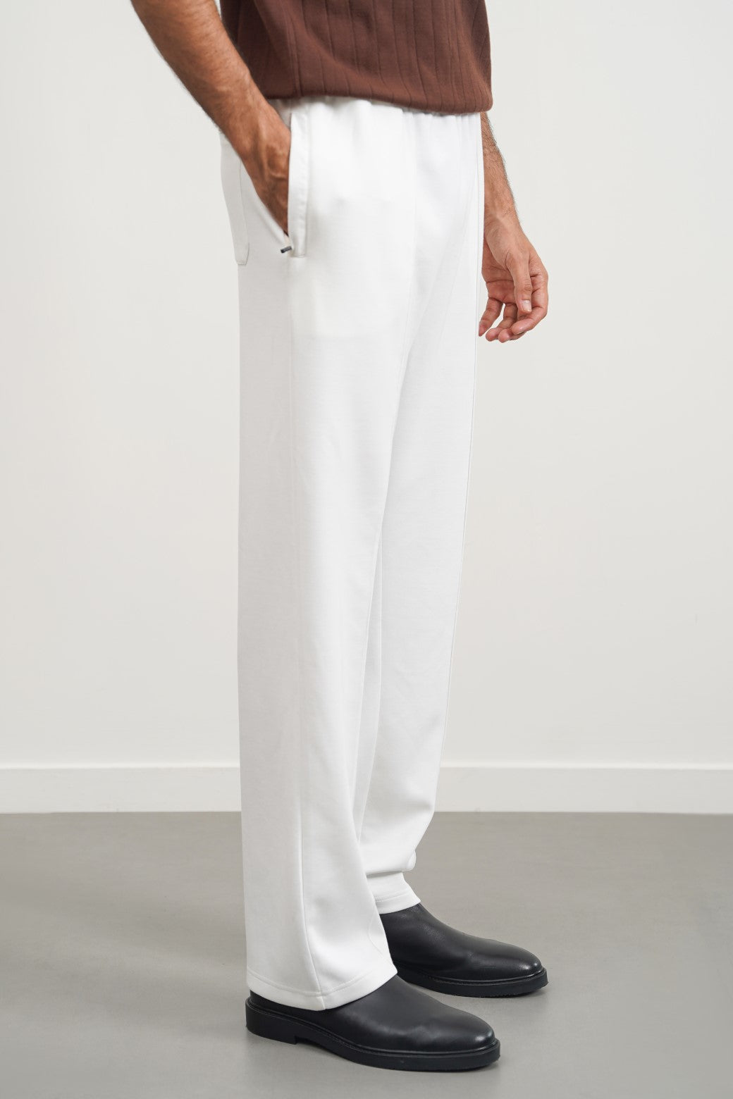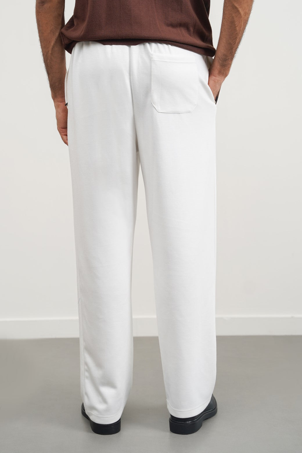 Design details: Relaxed fit trousers with an adjustable elasticated drawstring waistband. Front pockets and back patch pocket. Seam detail on the front of the legs.