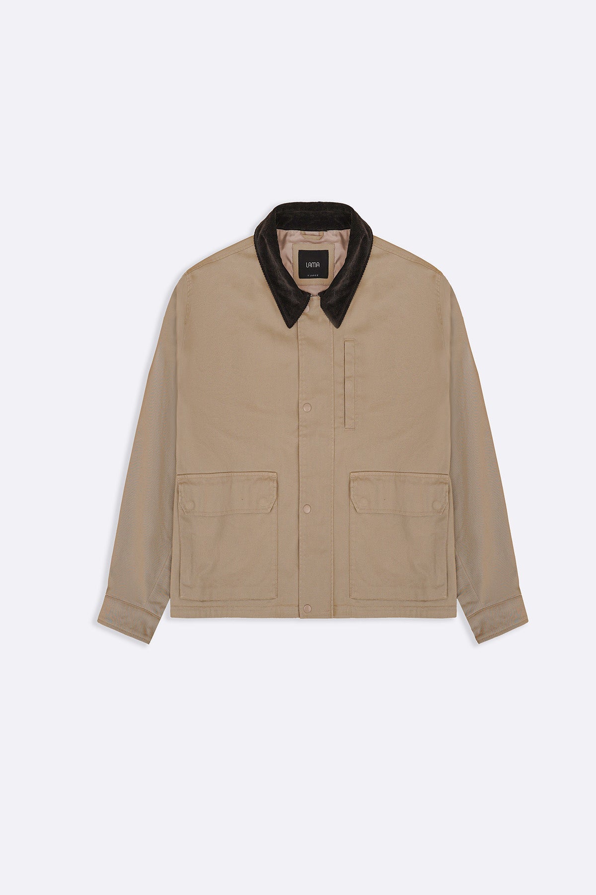 Design details: A relaxed utilitarian-style jacket with a contrast corduroy collar, patch pockets, flaps and a tailored chest pocket, front zipper and snap button closure.