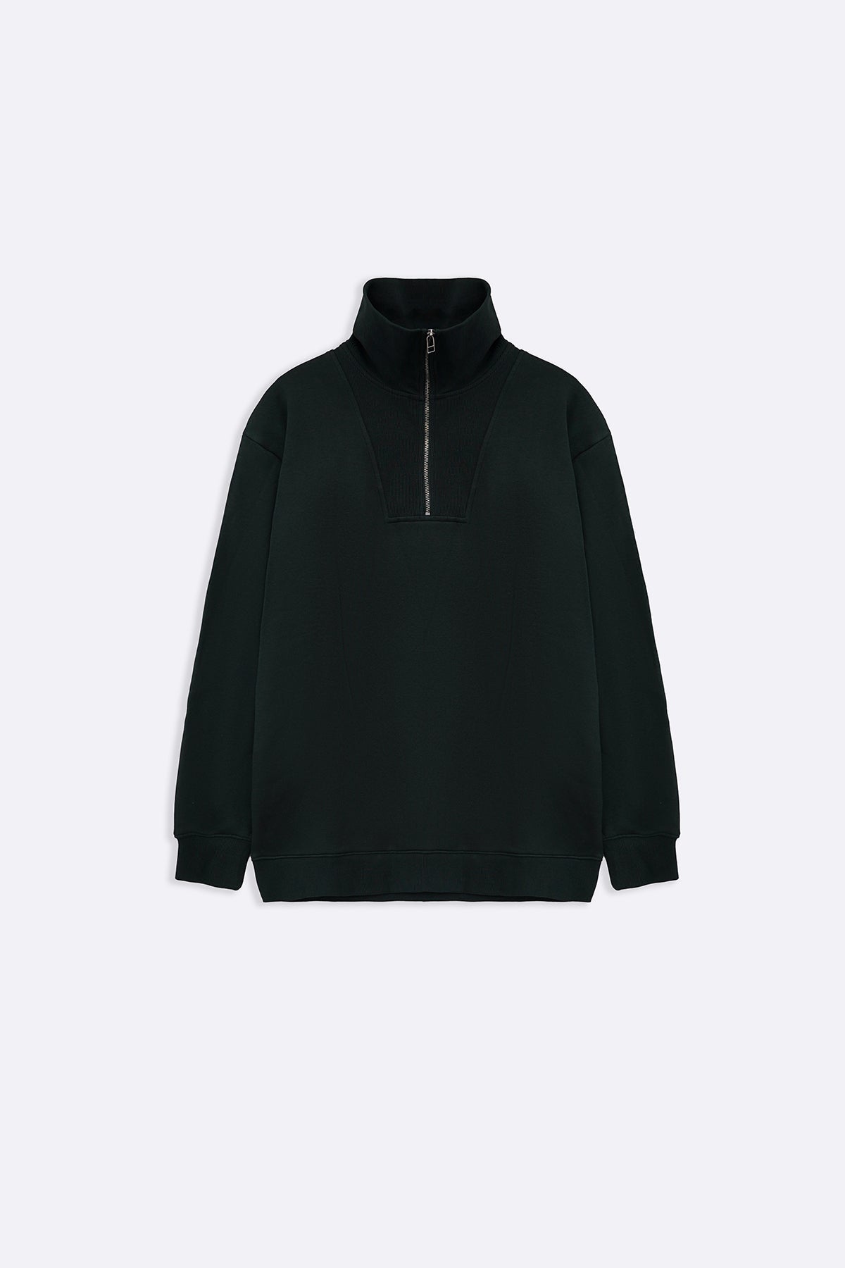 Design details: Mock neck sweatshirt with ribbed detailing on the neck area, with long sleeves and a quarter zip.