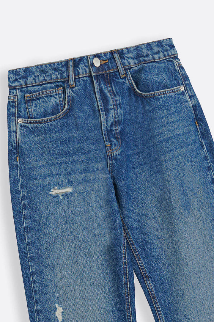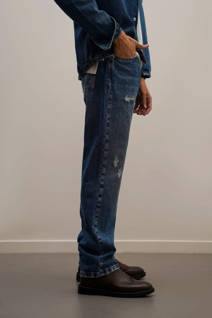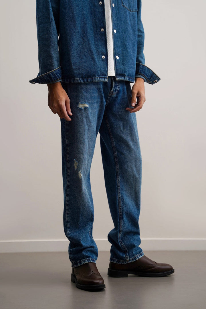 Design details: Relaxed straight jeans with scoop pockets, watch pocket, back patch pockets, back yoke