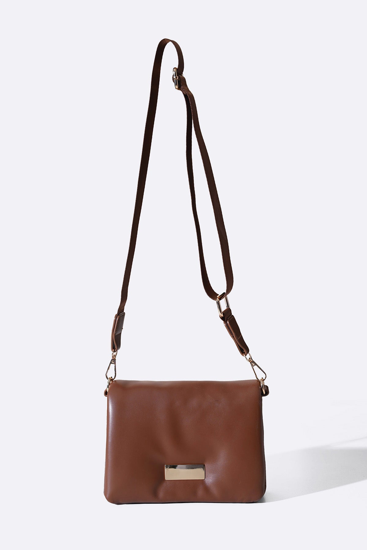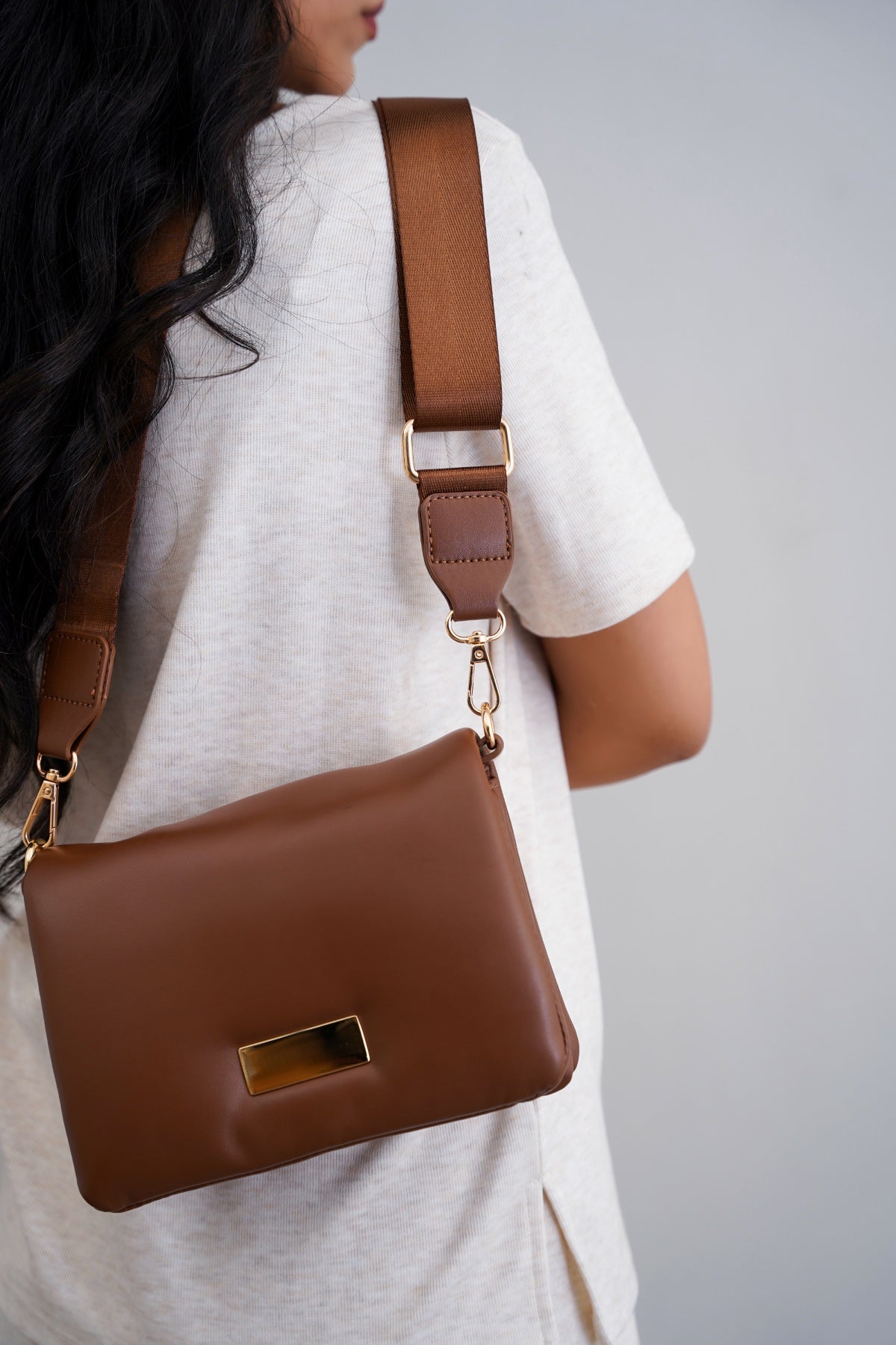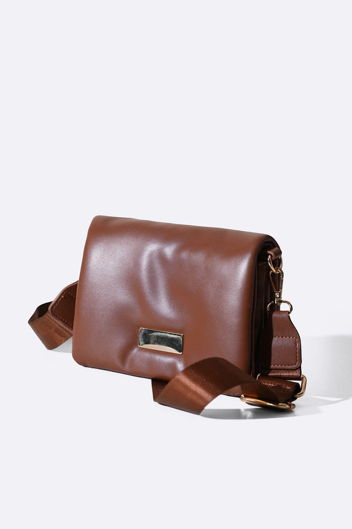 Pillow soft and convenient crossbody bag with metalic plate at the front, an adjustable, detachable wide matching strap and two main zip pockets to hold your belongings. It comes with an inside slip pocket and has a magnetic snap button closure.