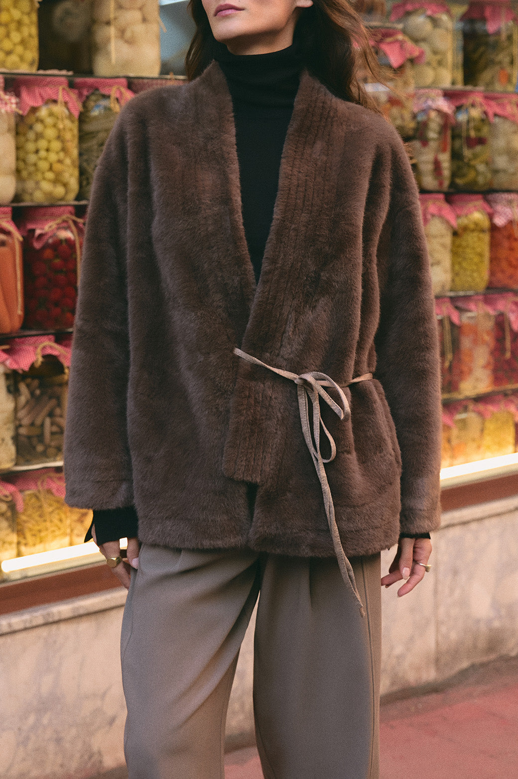 Design details: Faux fur wrap coat featuring a shawl collar design with a tie knot detail, side pockets, and full-length sleeves.