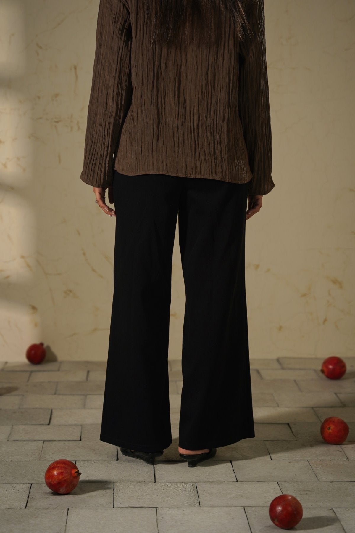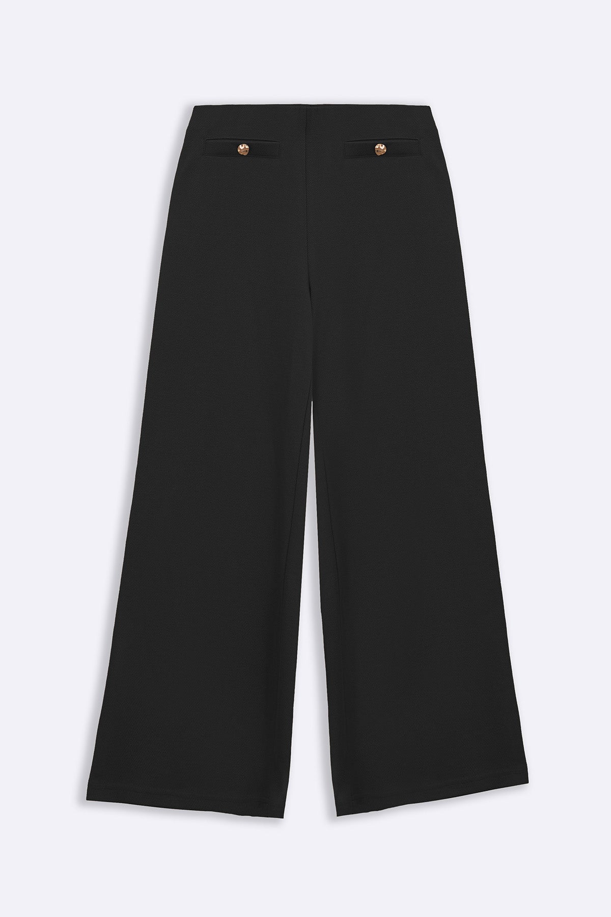 Design details: A concealed belted waistband with faux welt pockets at the front and back darts, complemented by decorative golden buttons on the pockets.