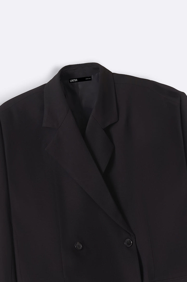 Design details: Double breasted oversized blazer with welt pockets and a long slit at the back.
