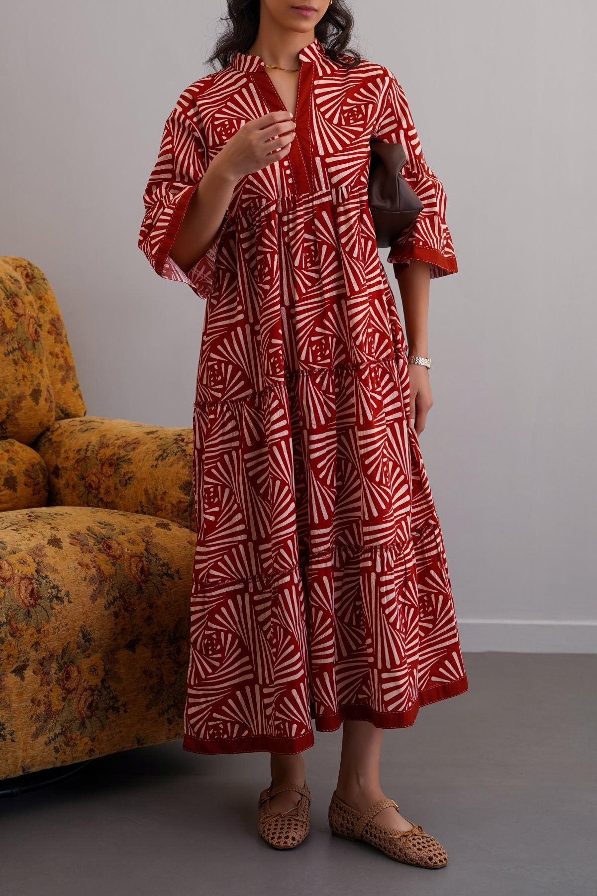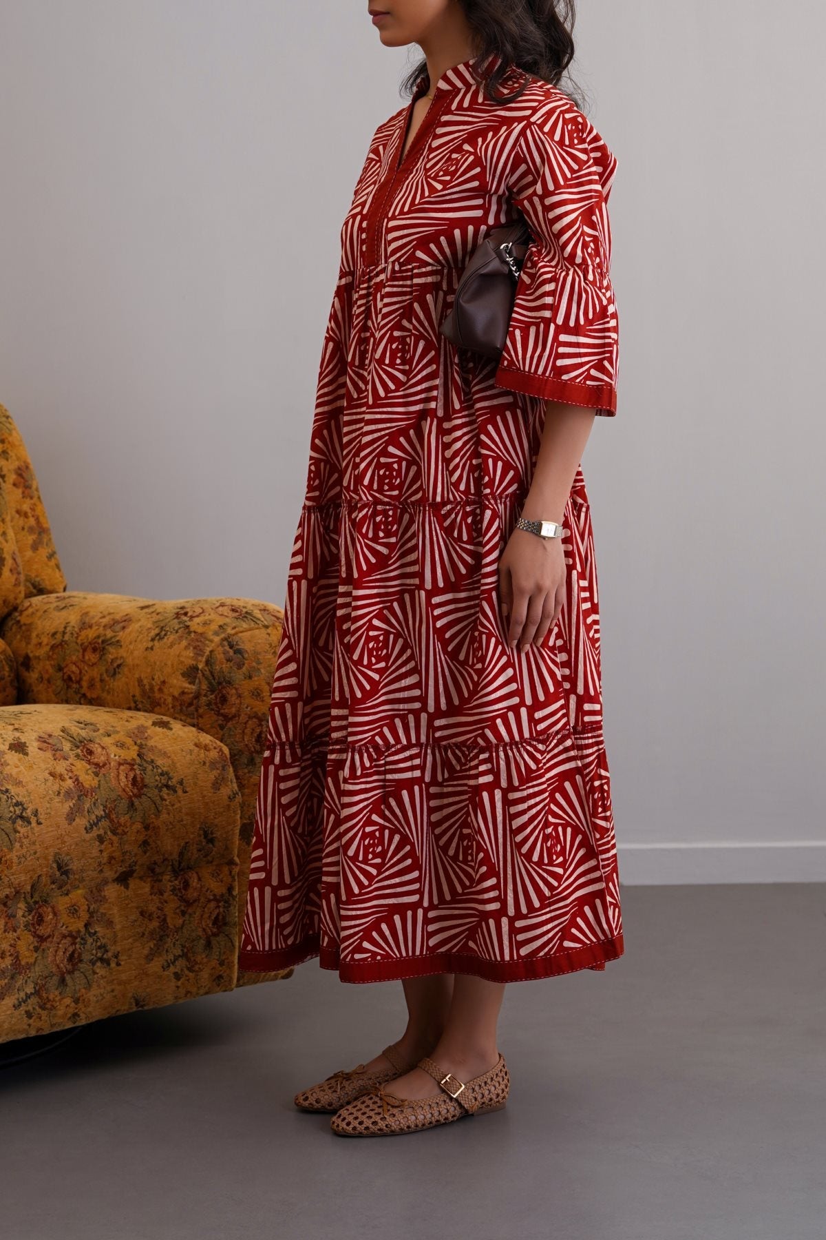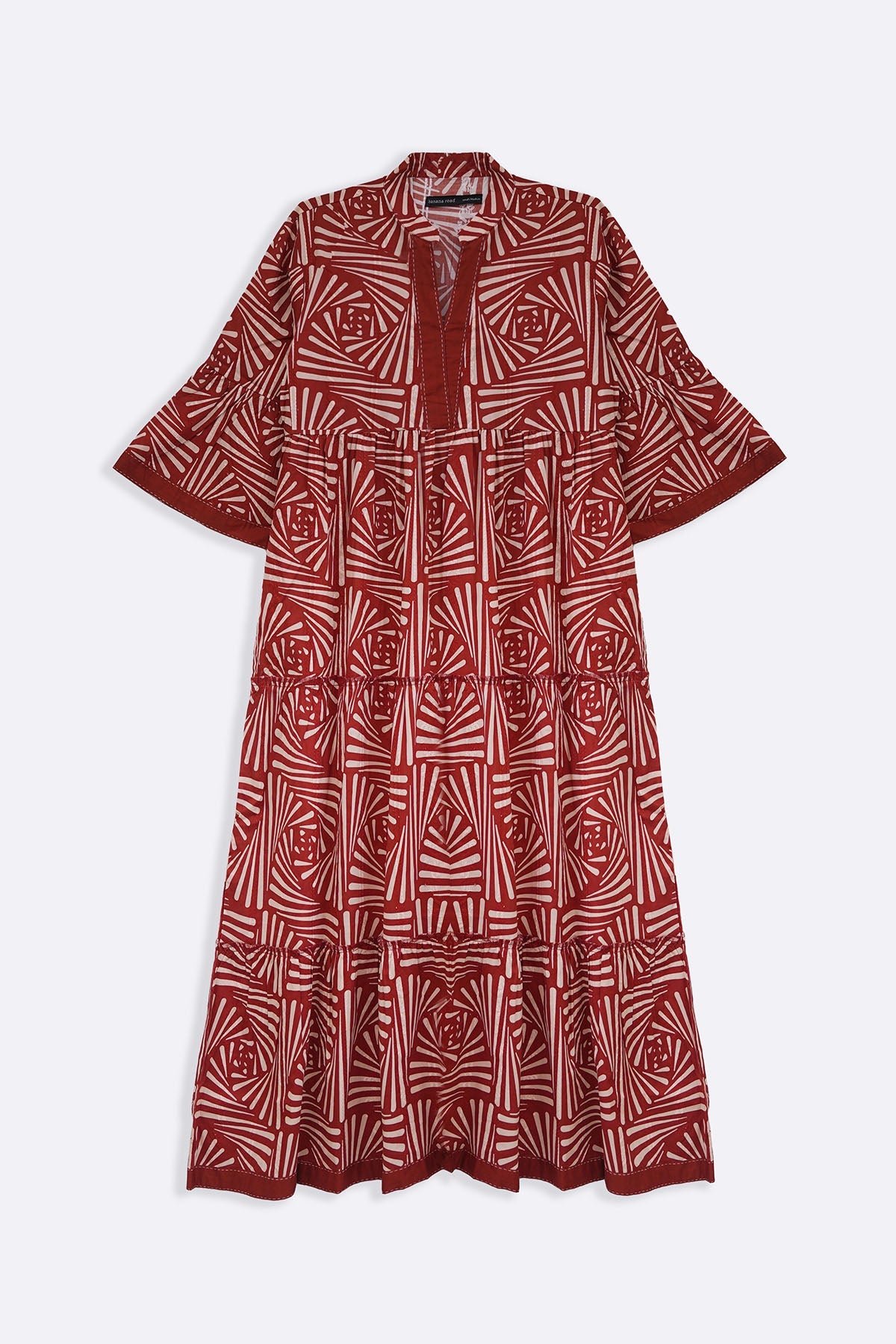 Design details: Printed tiered dress with embroidery, band collar V-neckline and three quarter sleeves.