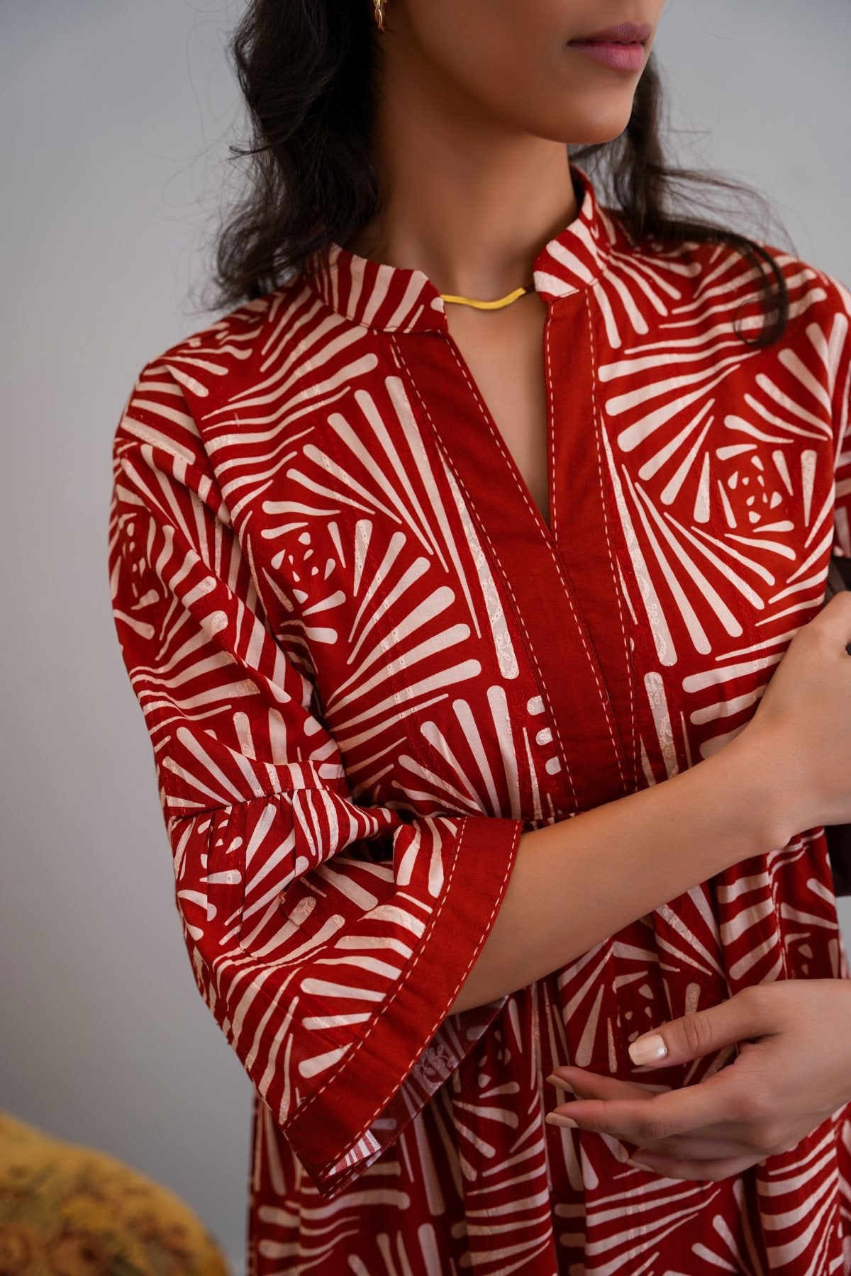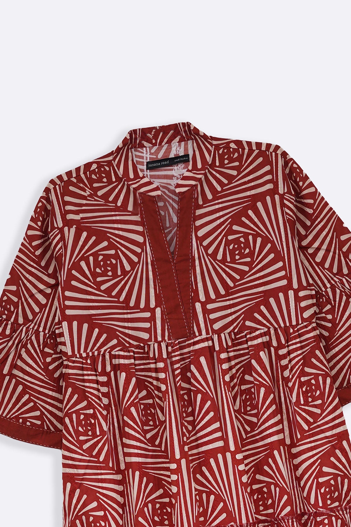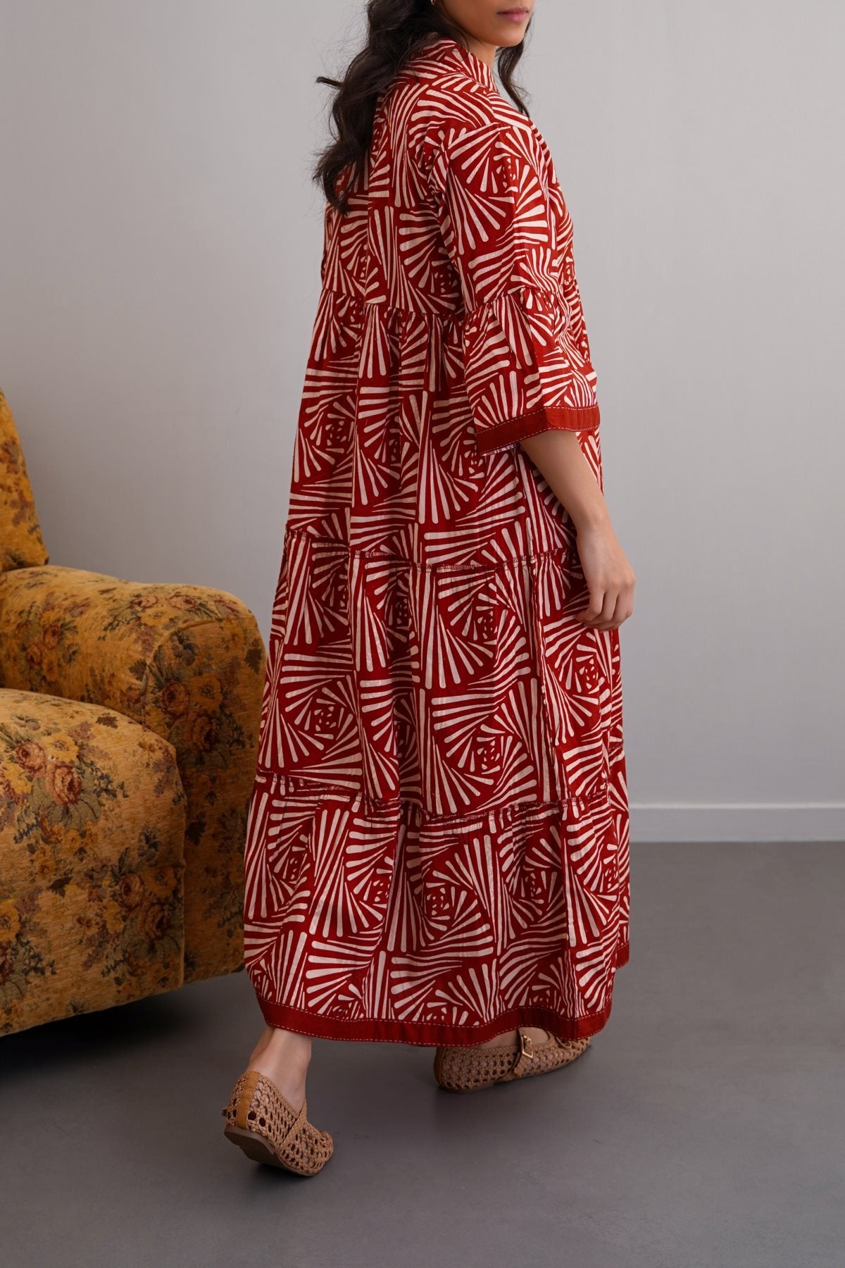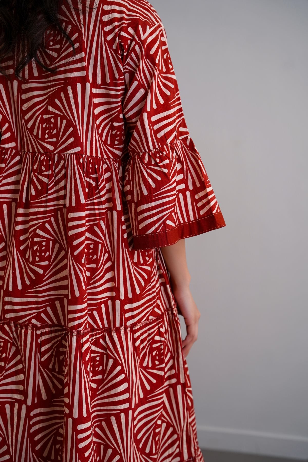 Design details: Printed tiered dress with embroidery, band collar V-neckline and three quarter sleeves.