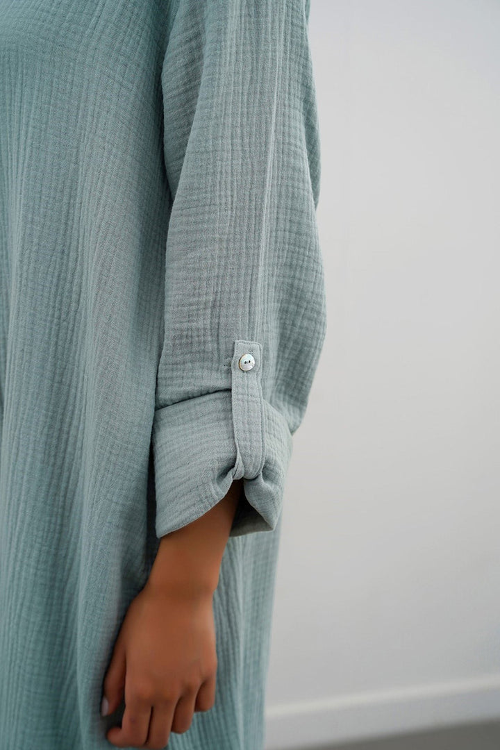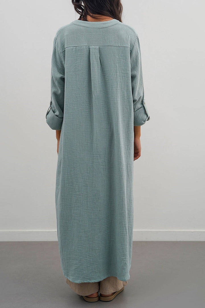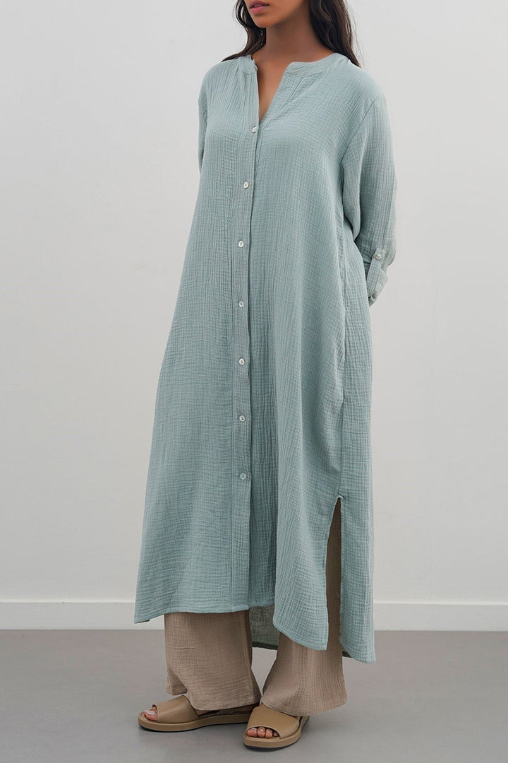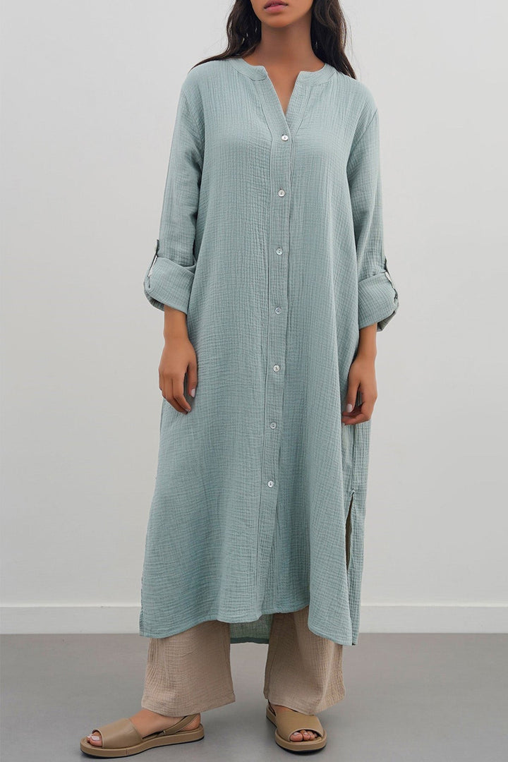 Design details: Mother-of-pearl buttons, fold-up sleeves, band collar design, short side slit.