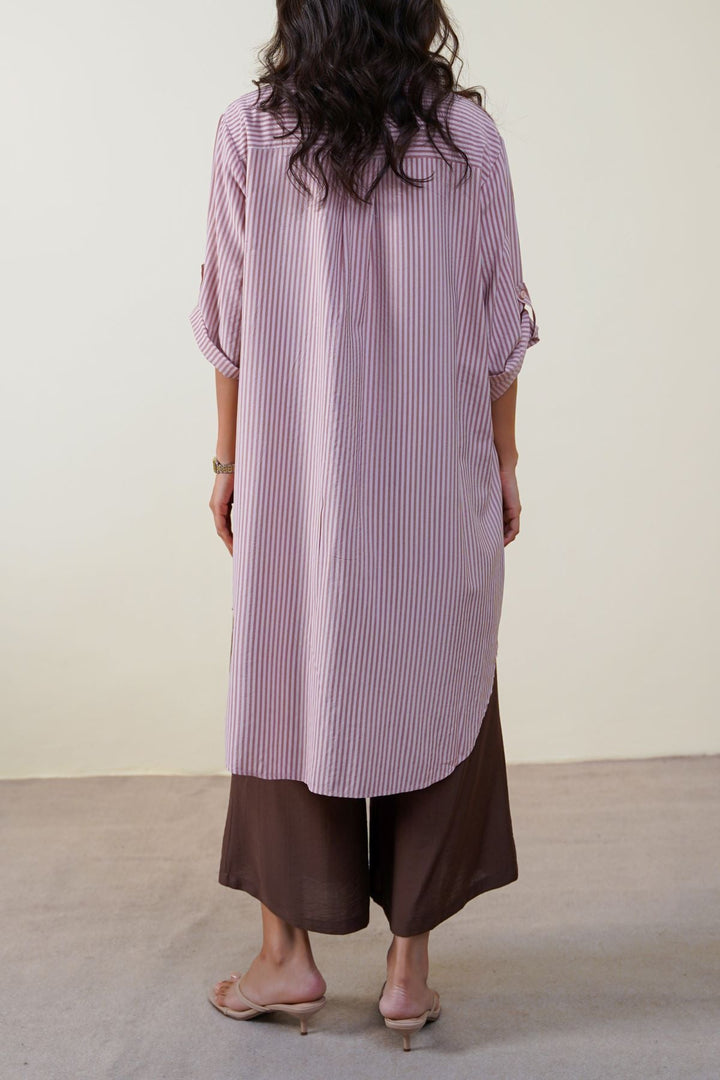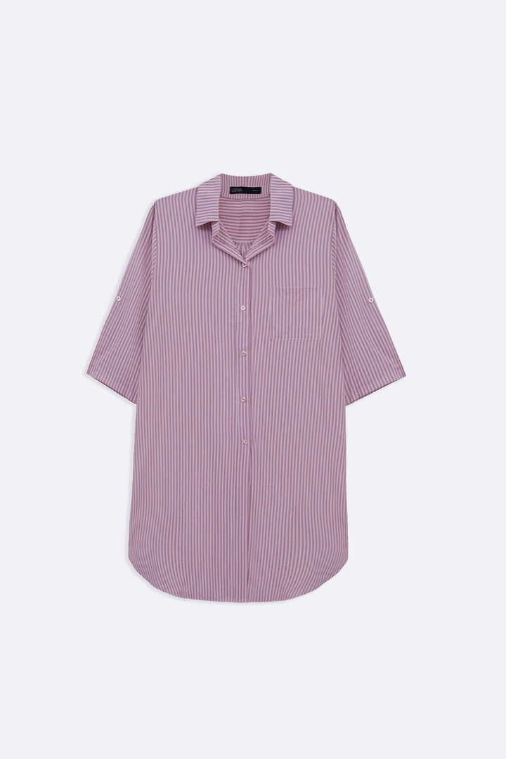 Design details: Button down tunic with three quarter sleeves, high low rounded hem and back pleat detail.