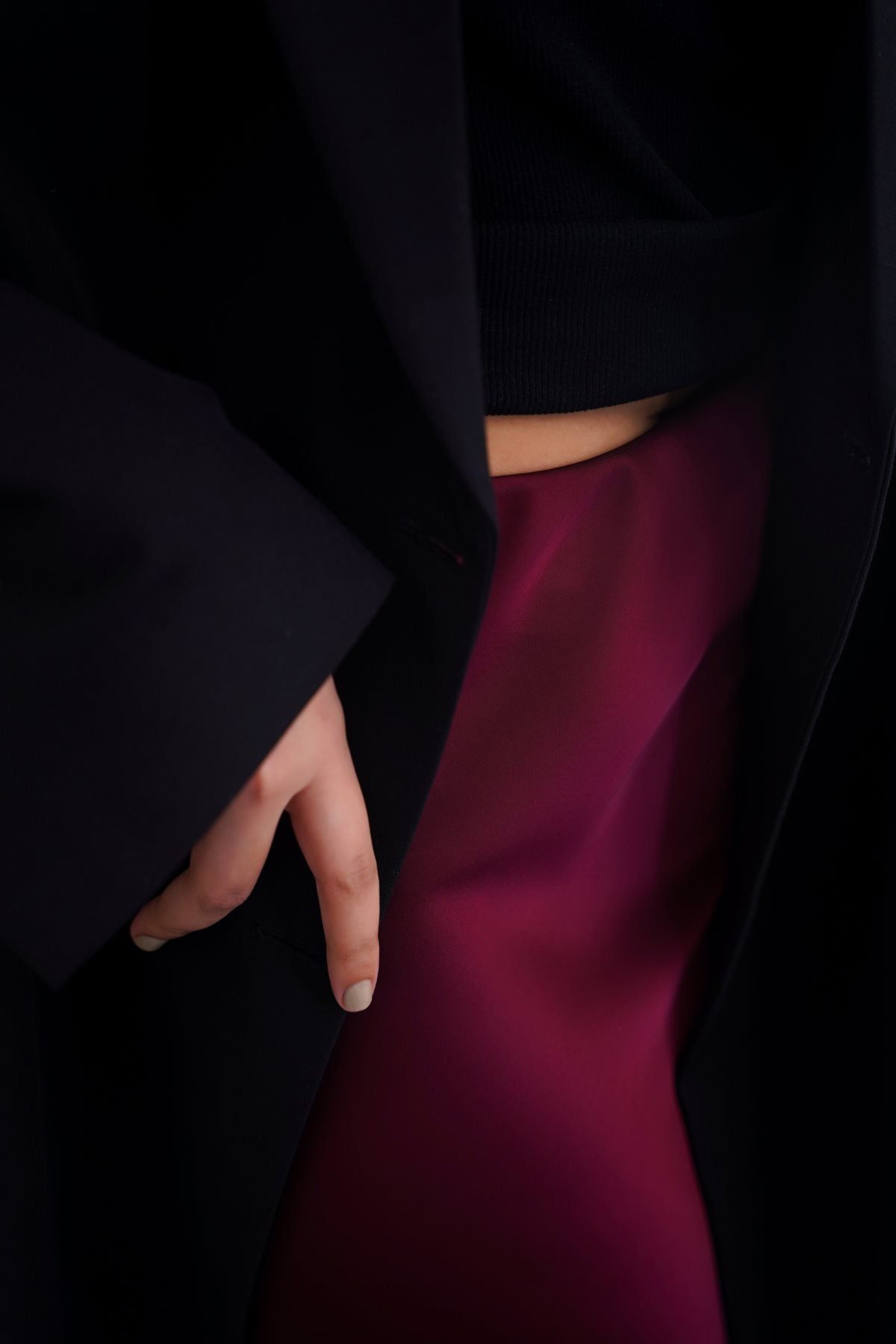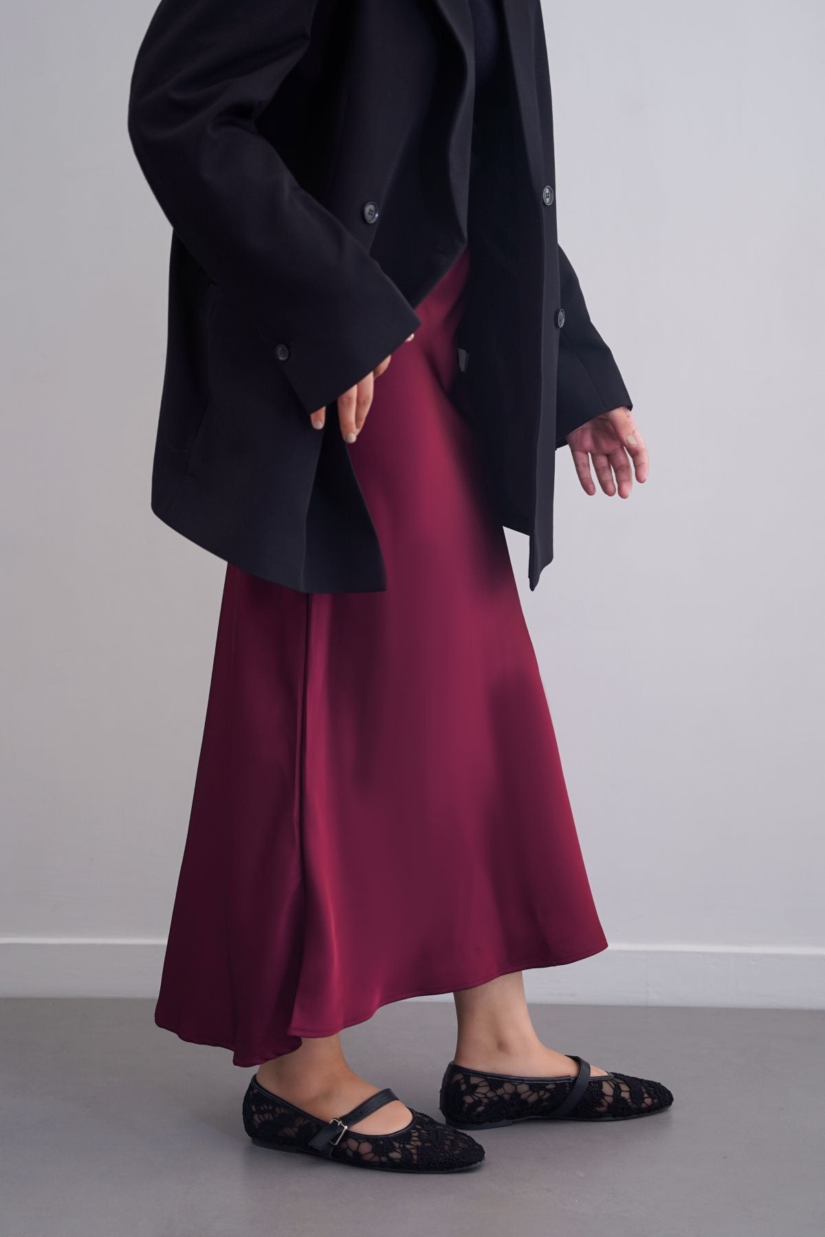 Design details: High-waist midi skirt with hidden elastic waist band and flared hem.