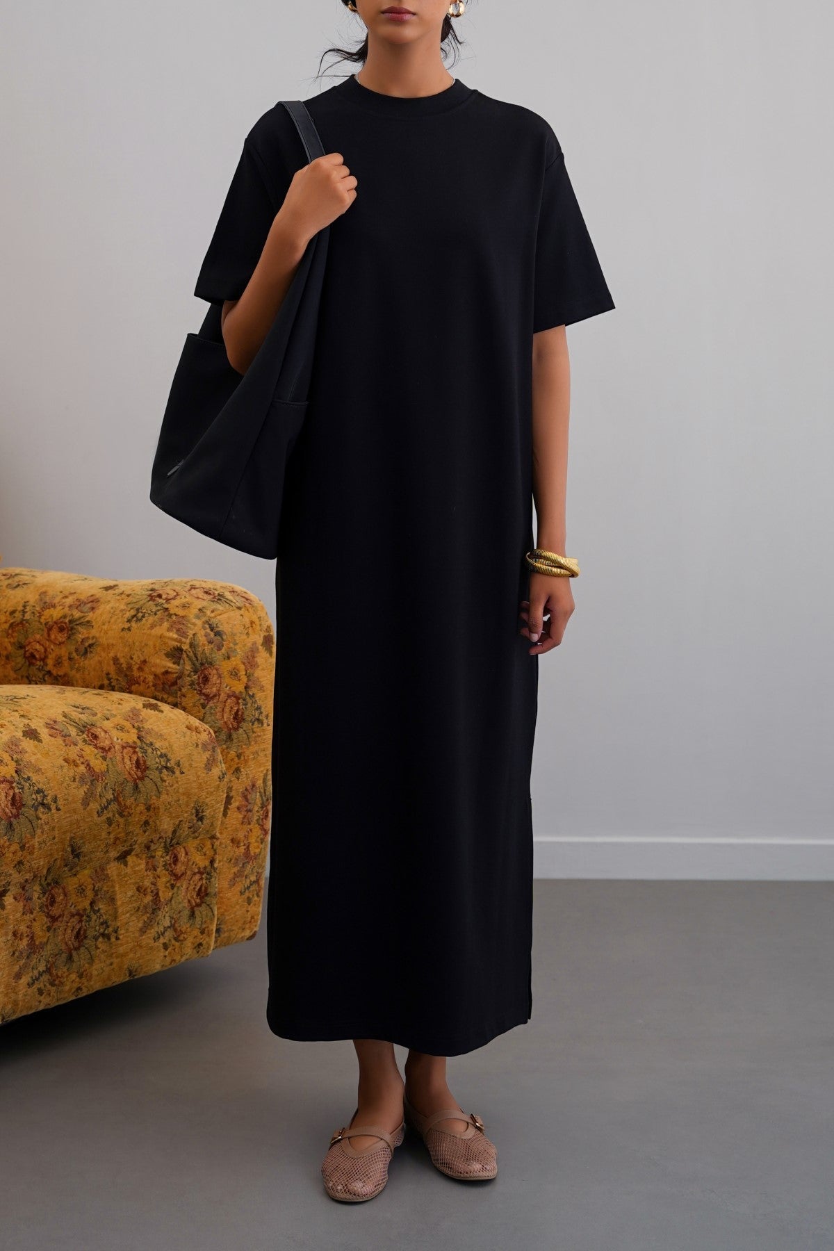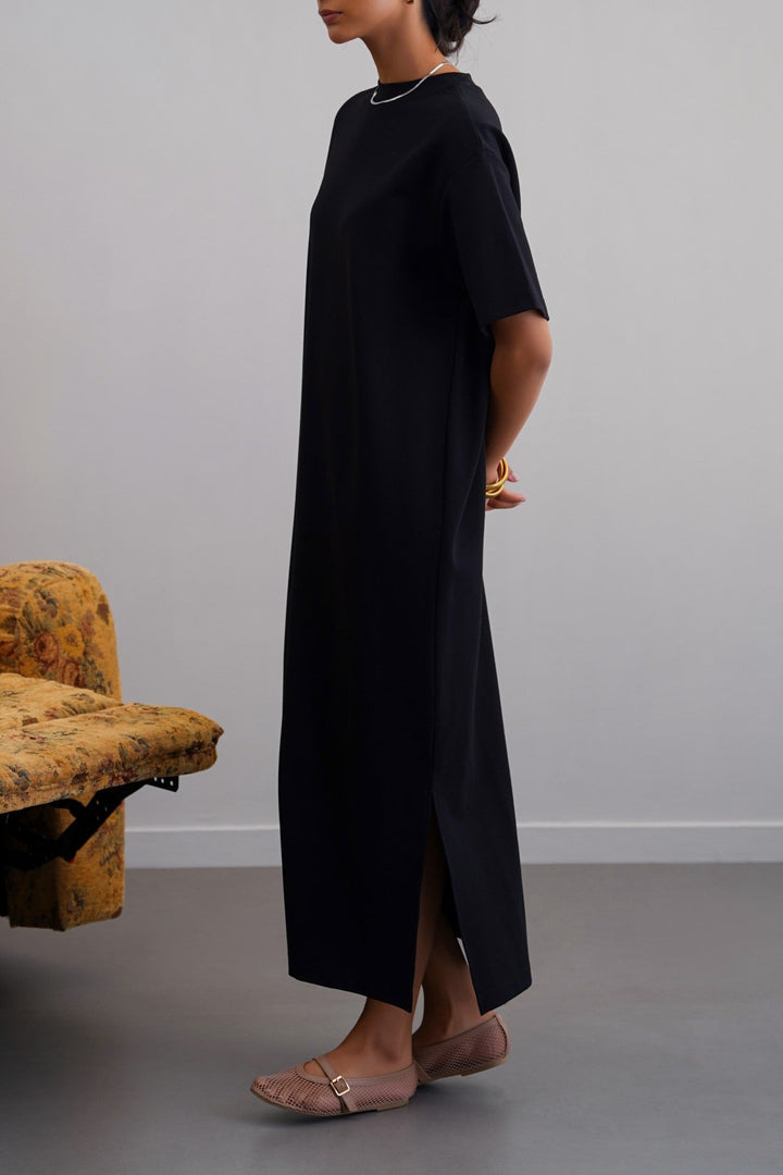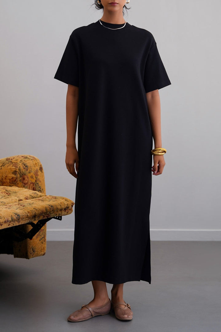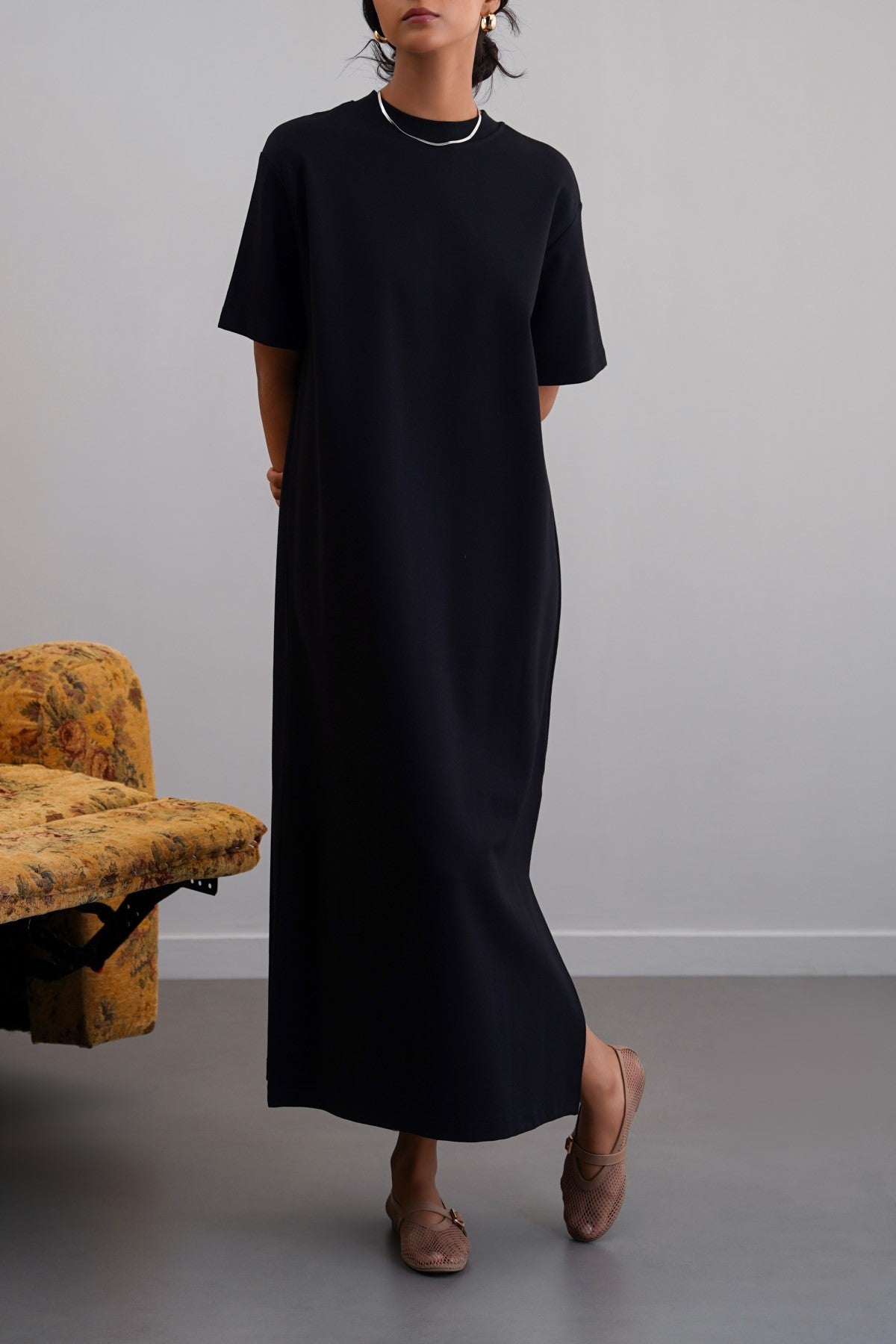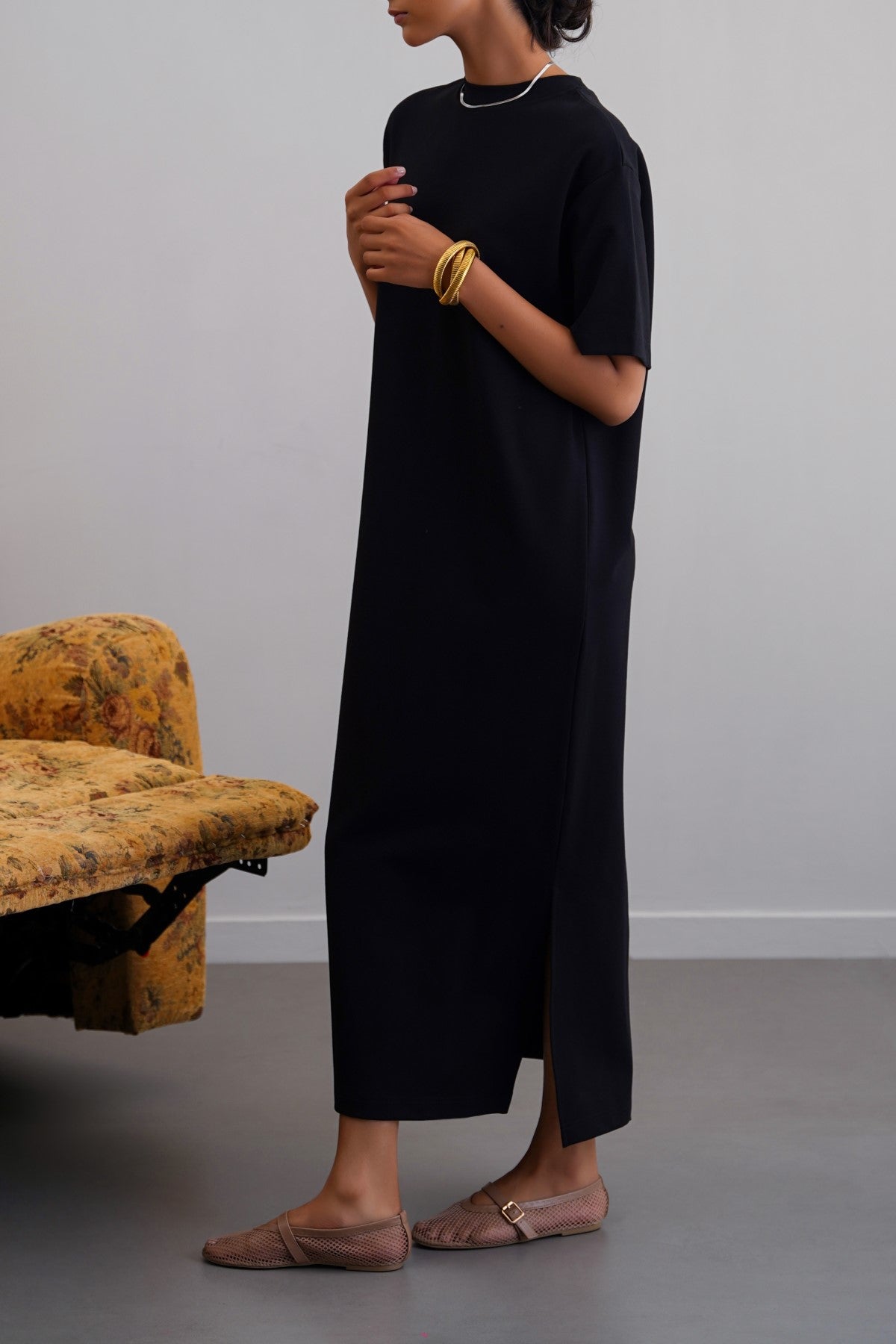 Design details: Heavy viscose classic crew neck tee dress with side slit