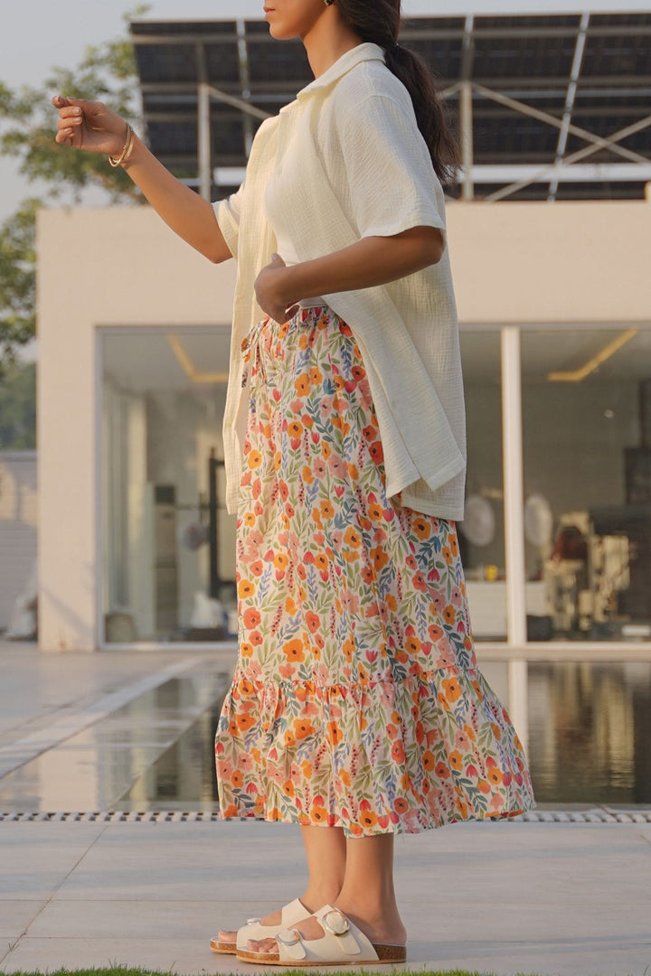 Design details: Long printed tier skirt with an all around elasticated waistband and drawstring.