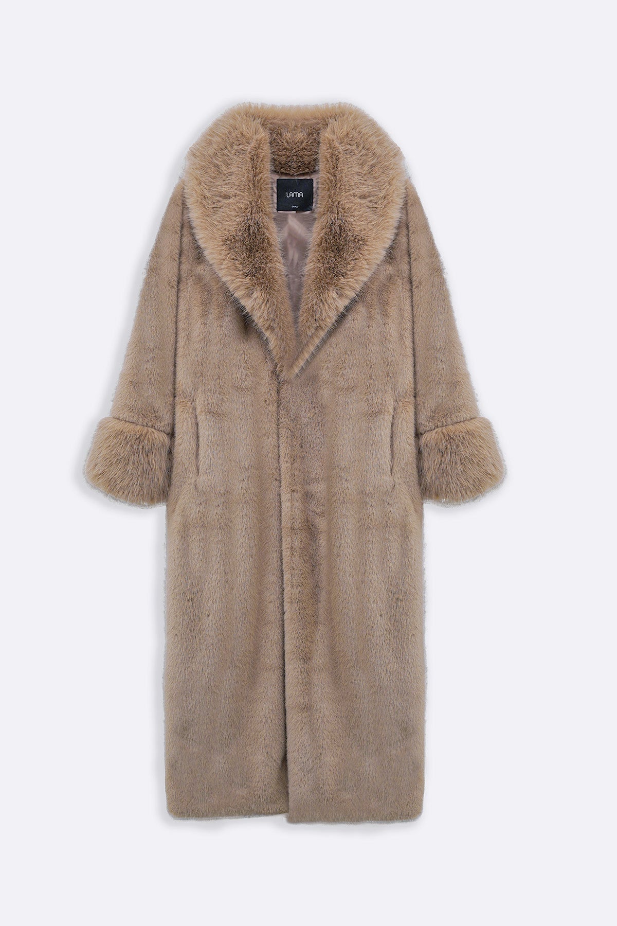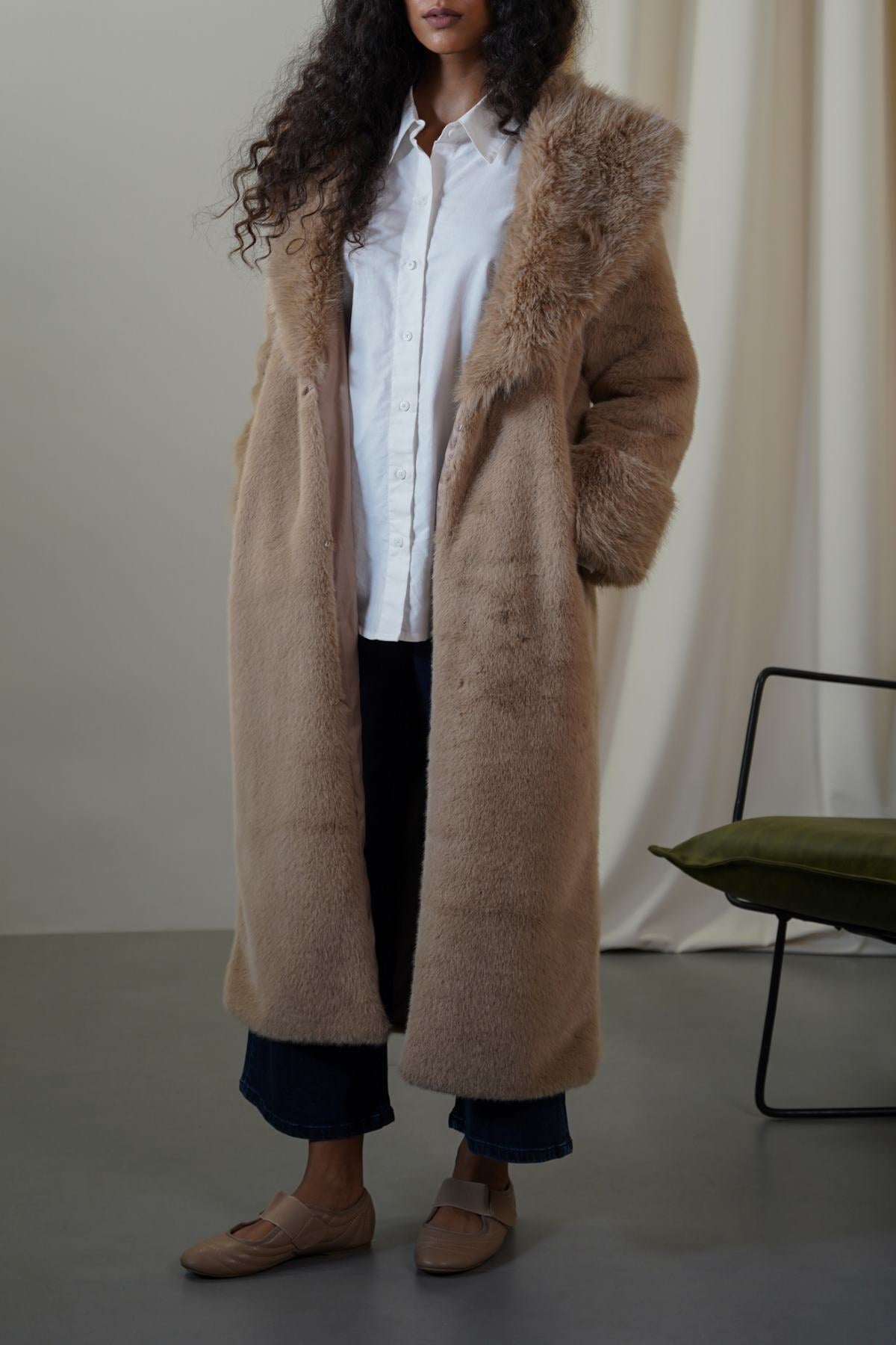 Design details: Long faux-fur coat with a plush shawl collar and cuffed sleeves, finished with a front hook-and-eye closure and side pockets.