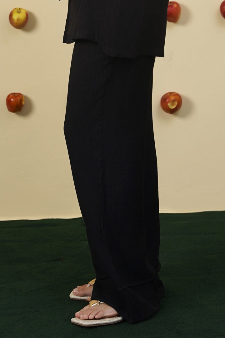 Design details: Relaxed fit pants with front side pockets, creased cut detail at bottom and an all around elasticated waistband with drawstring.