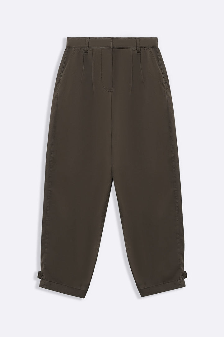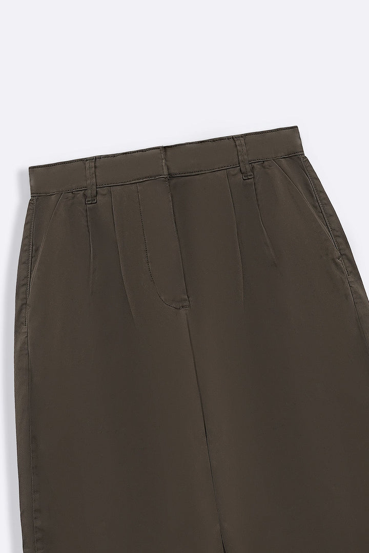 Design details: High waisted mom straight pants with front cross pockets, back bone pockets, pleats at front and zipper fly closure.