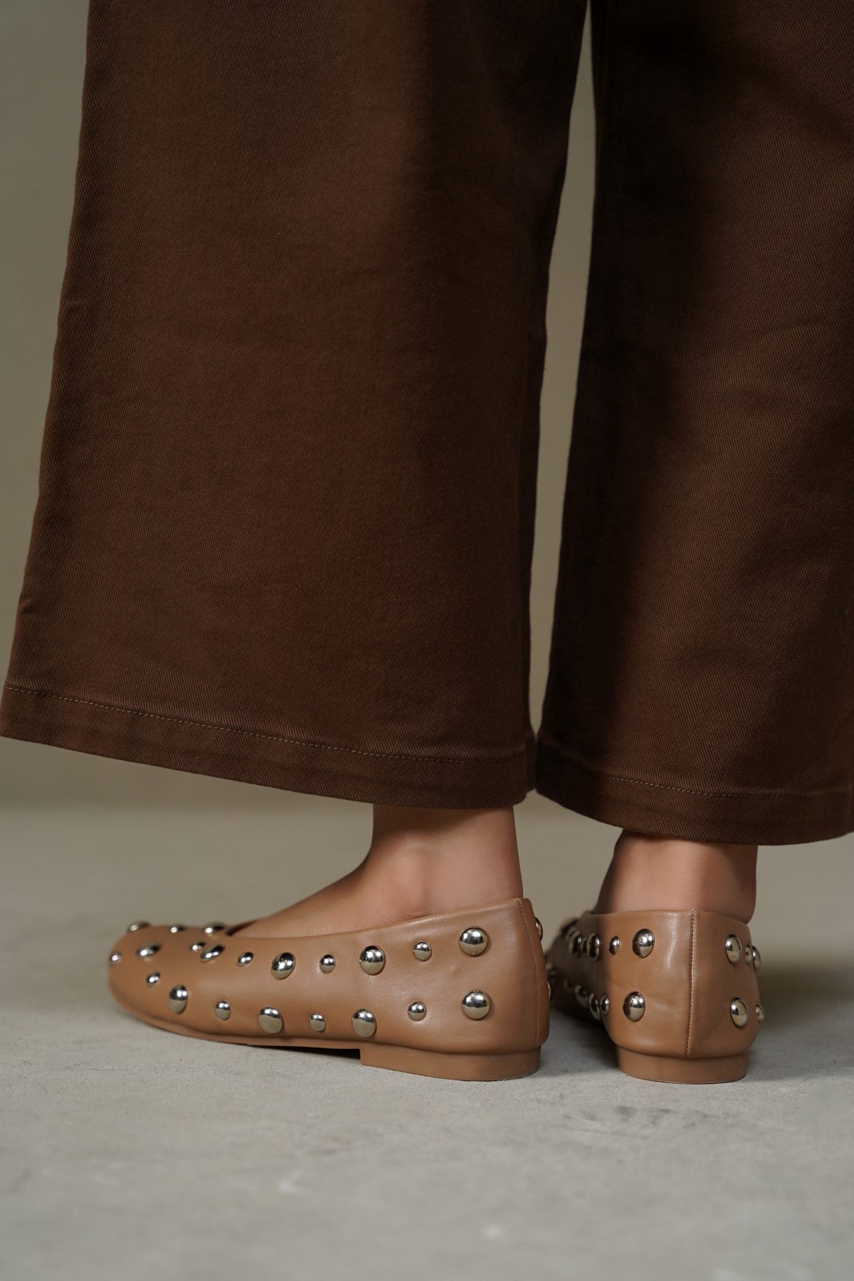 Soft studded pumps with cushioned insole and anti-slip outsole.