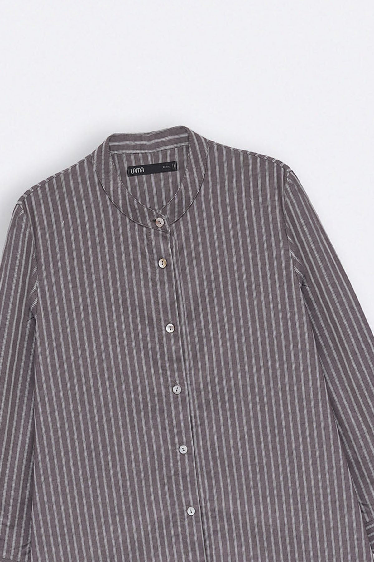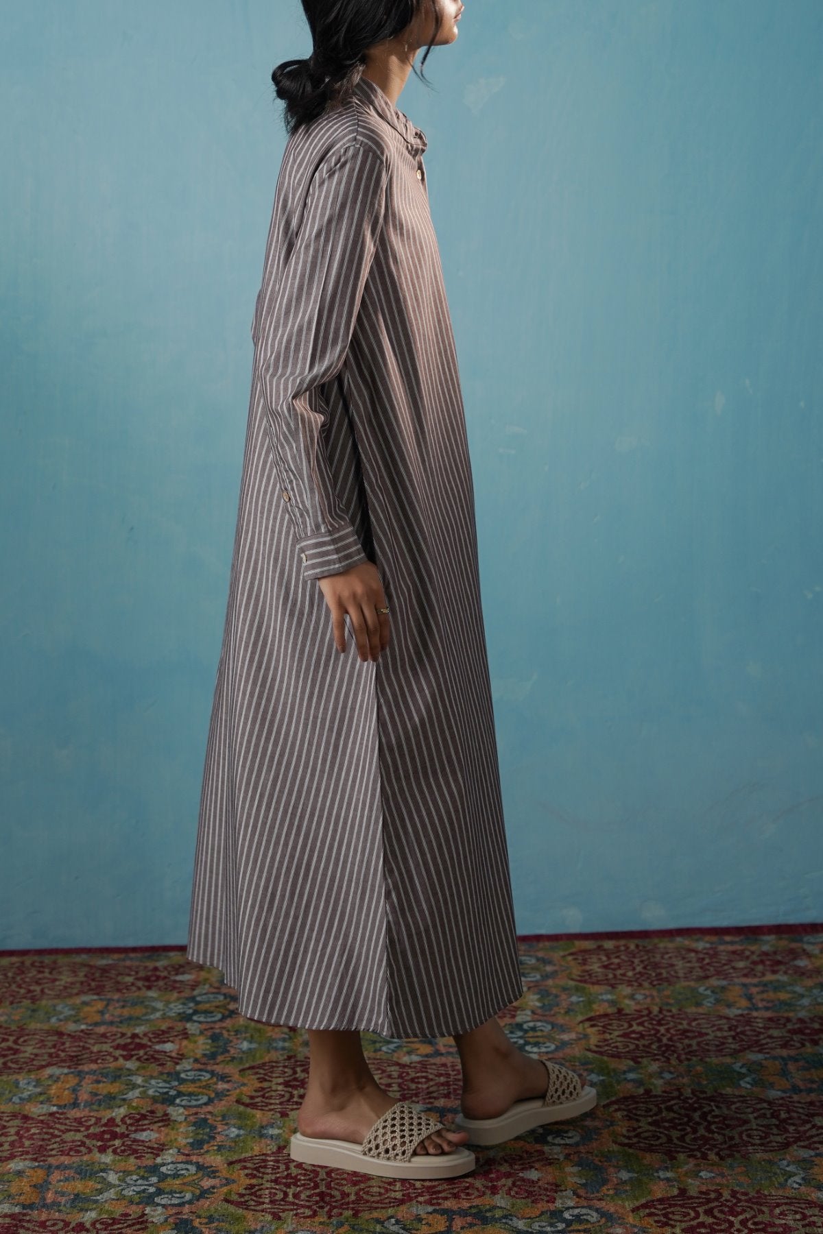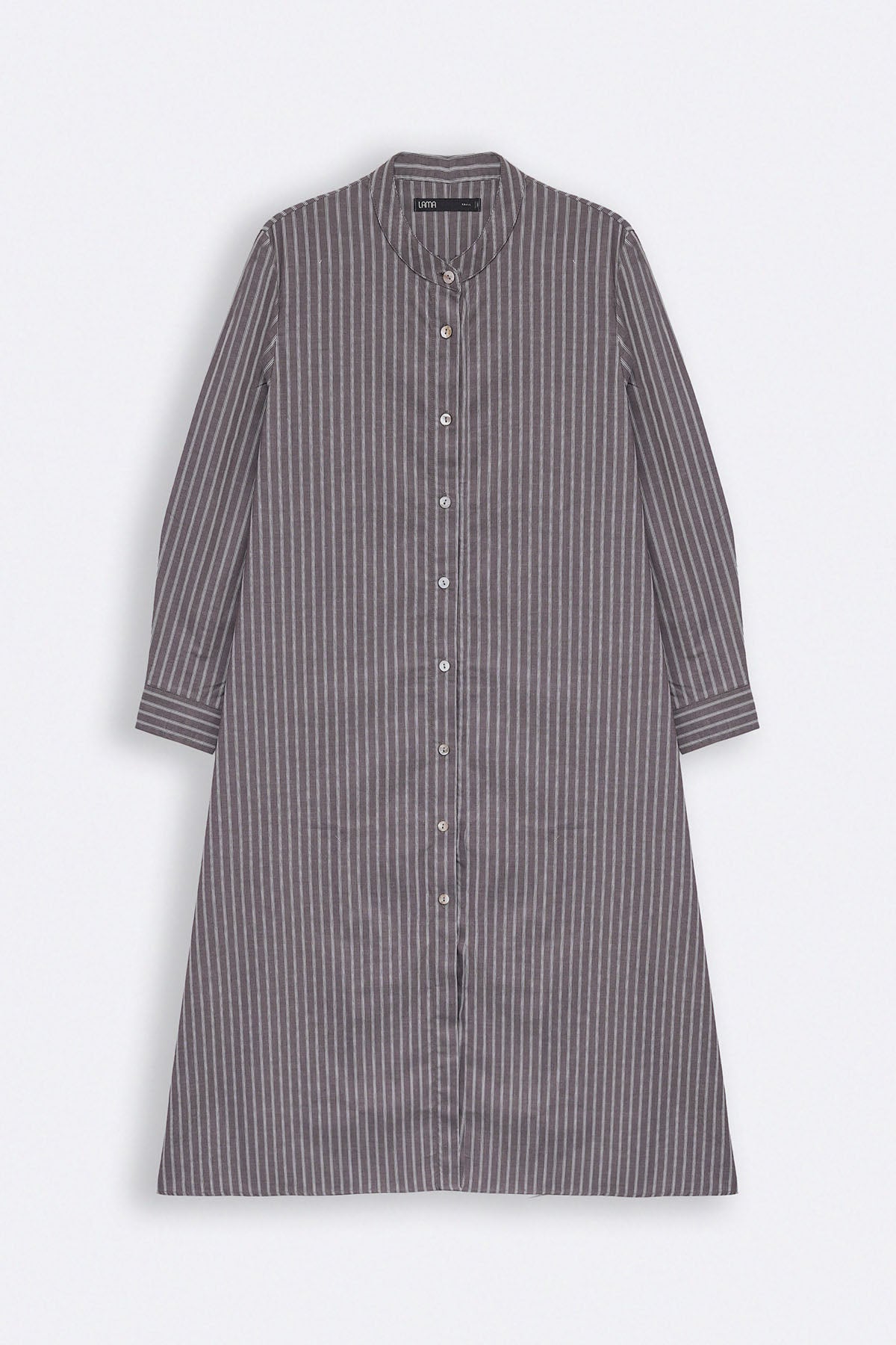 Design details: Striped long shirt dress with a band collar, side pockets and full sleeves finished with cuff detailing.