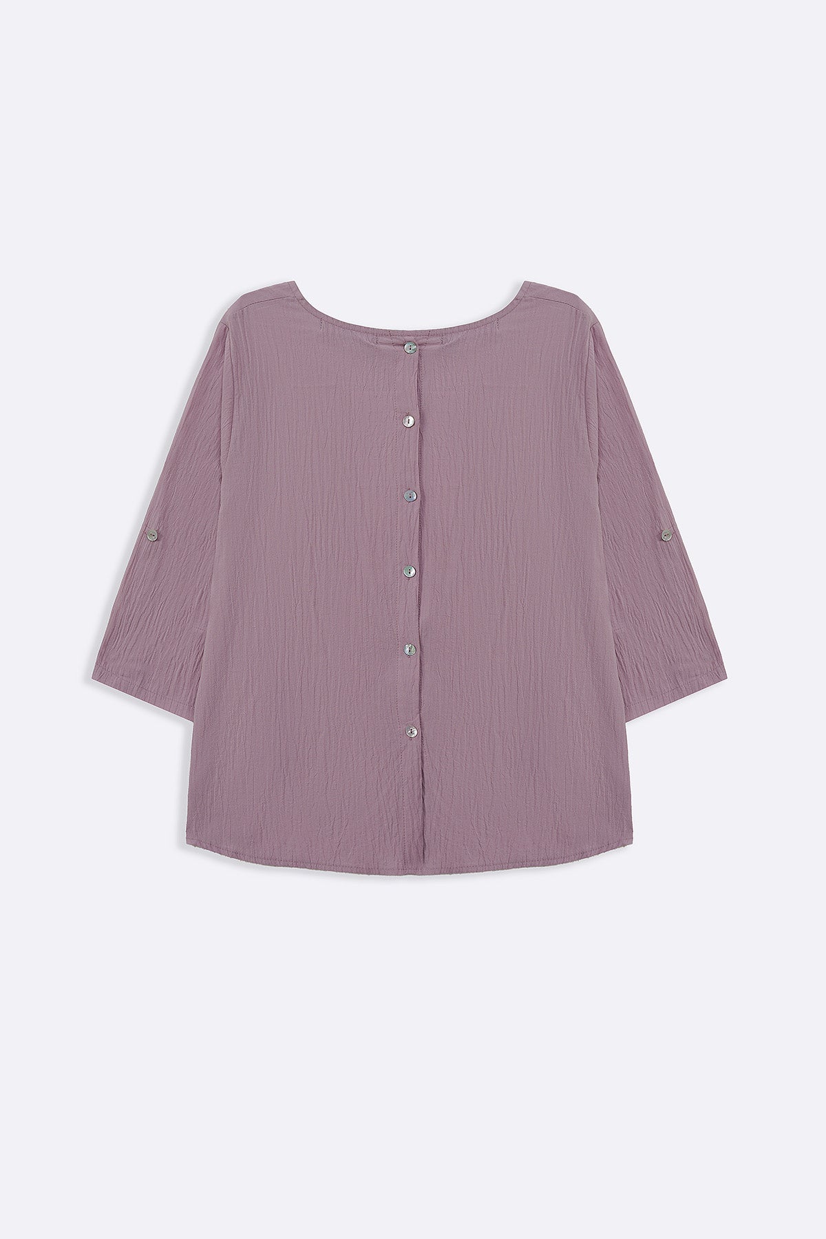 Design details: Round neck blouse with turn-up sleeve detail, and a button placket at back.
