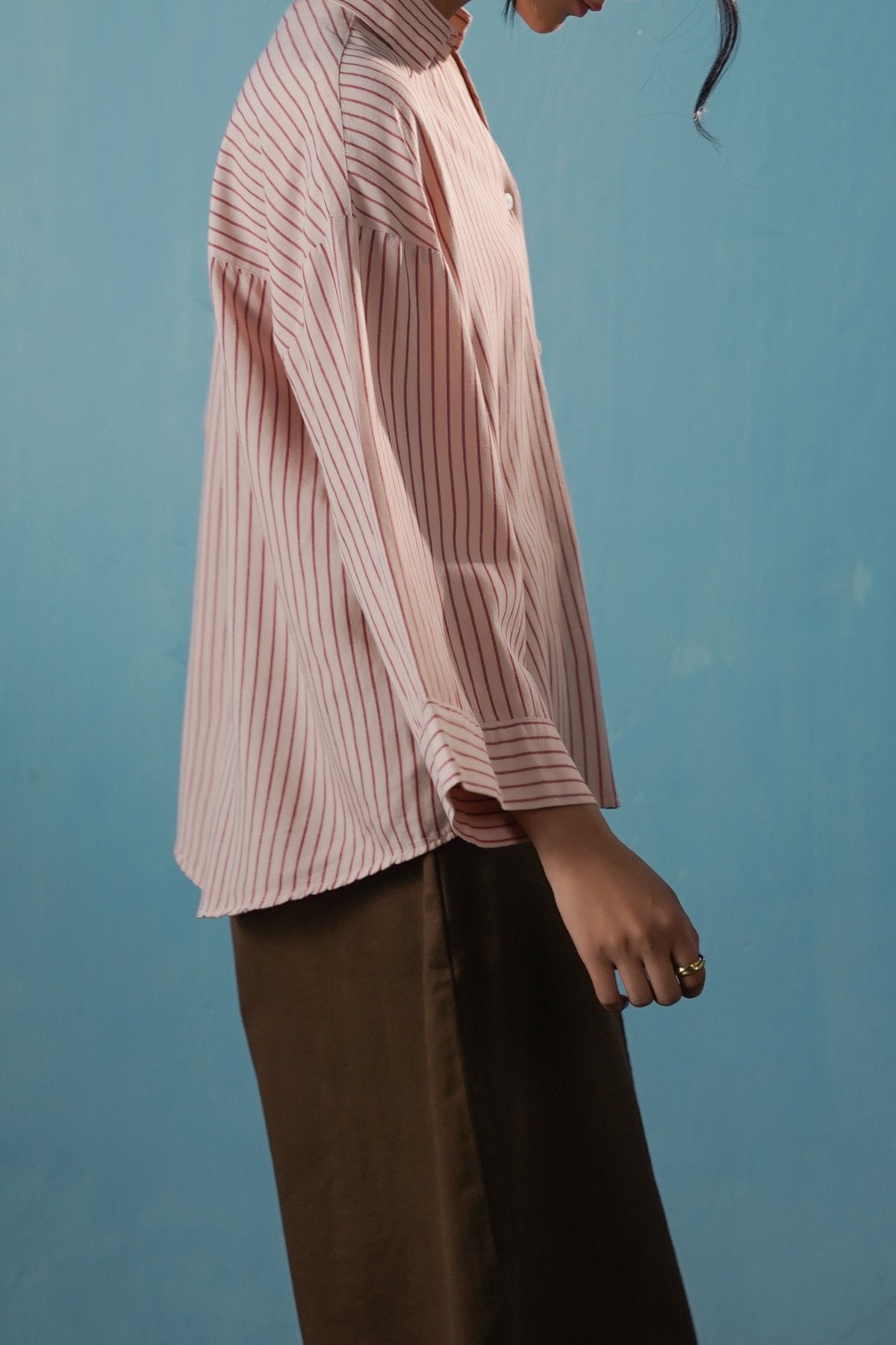 Design details: V neck collared button down shirt with three quarter sleeves and back pleat.