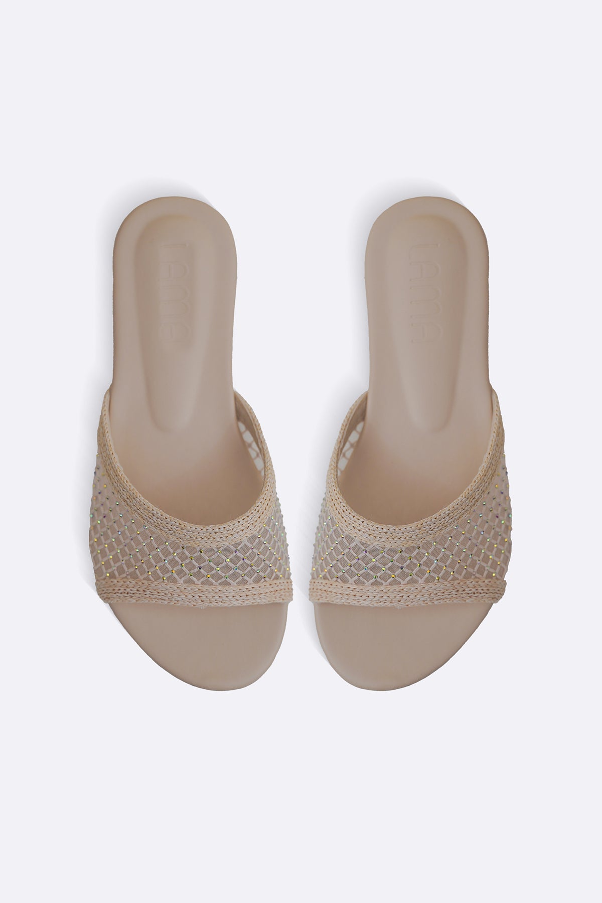 Occasion slides with studded mesh upper, cushioned insole and anti-slip outsole.