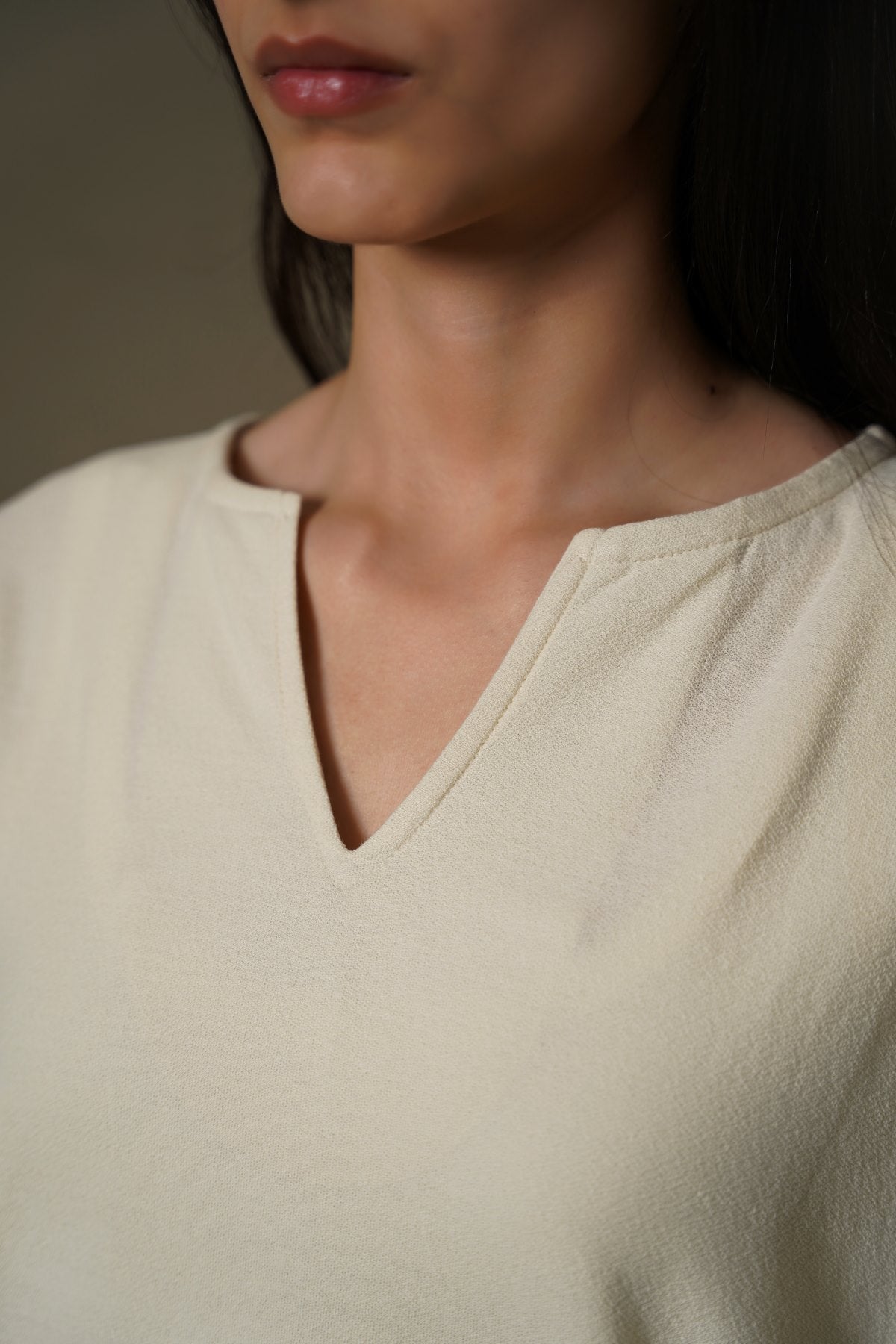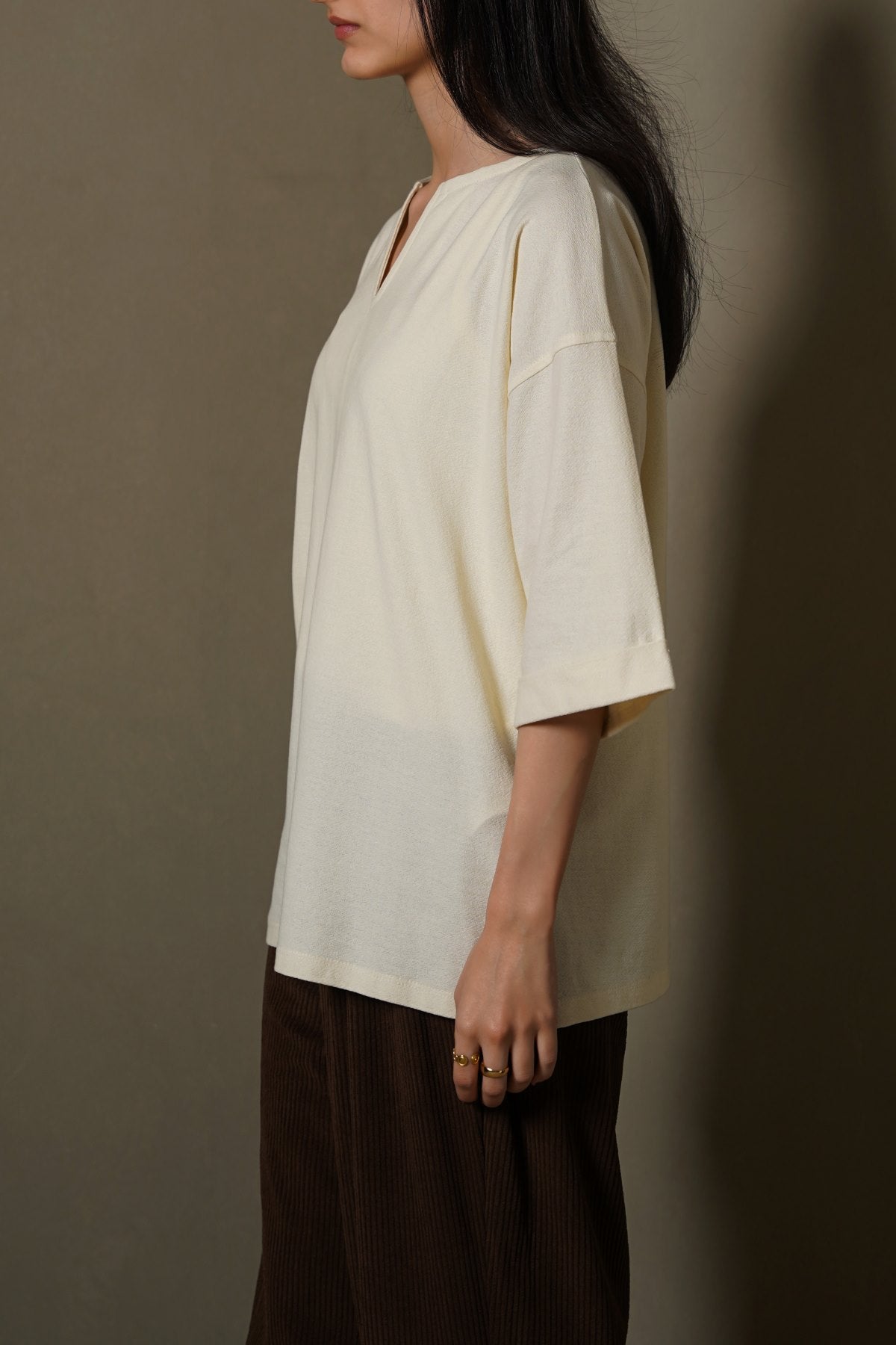 Design details: Crepe jersey v-neck tee with three quarter sleeves with a folded hem along with side vents