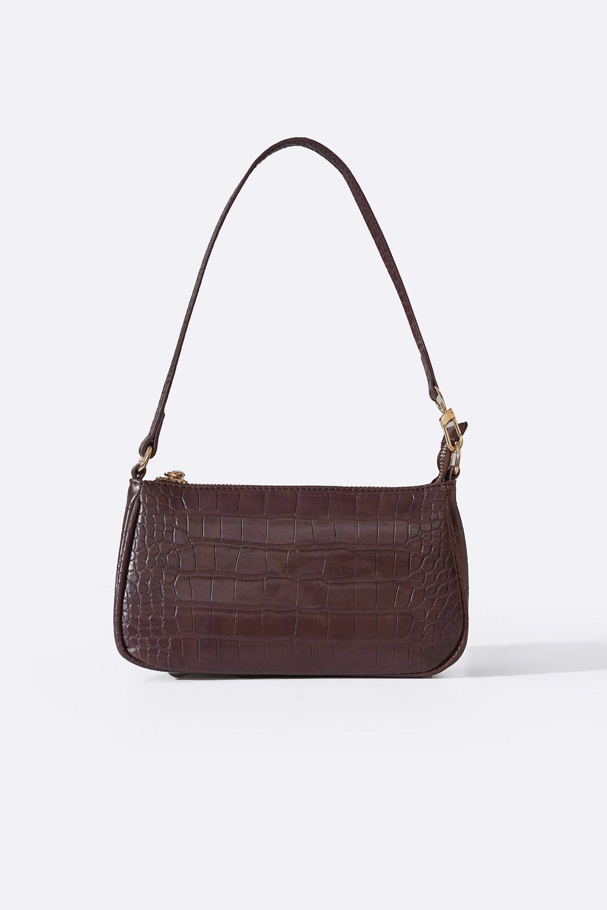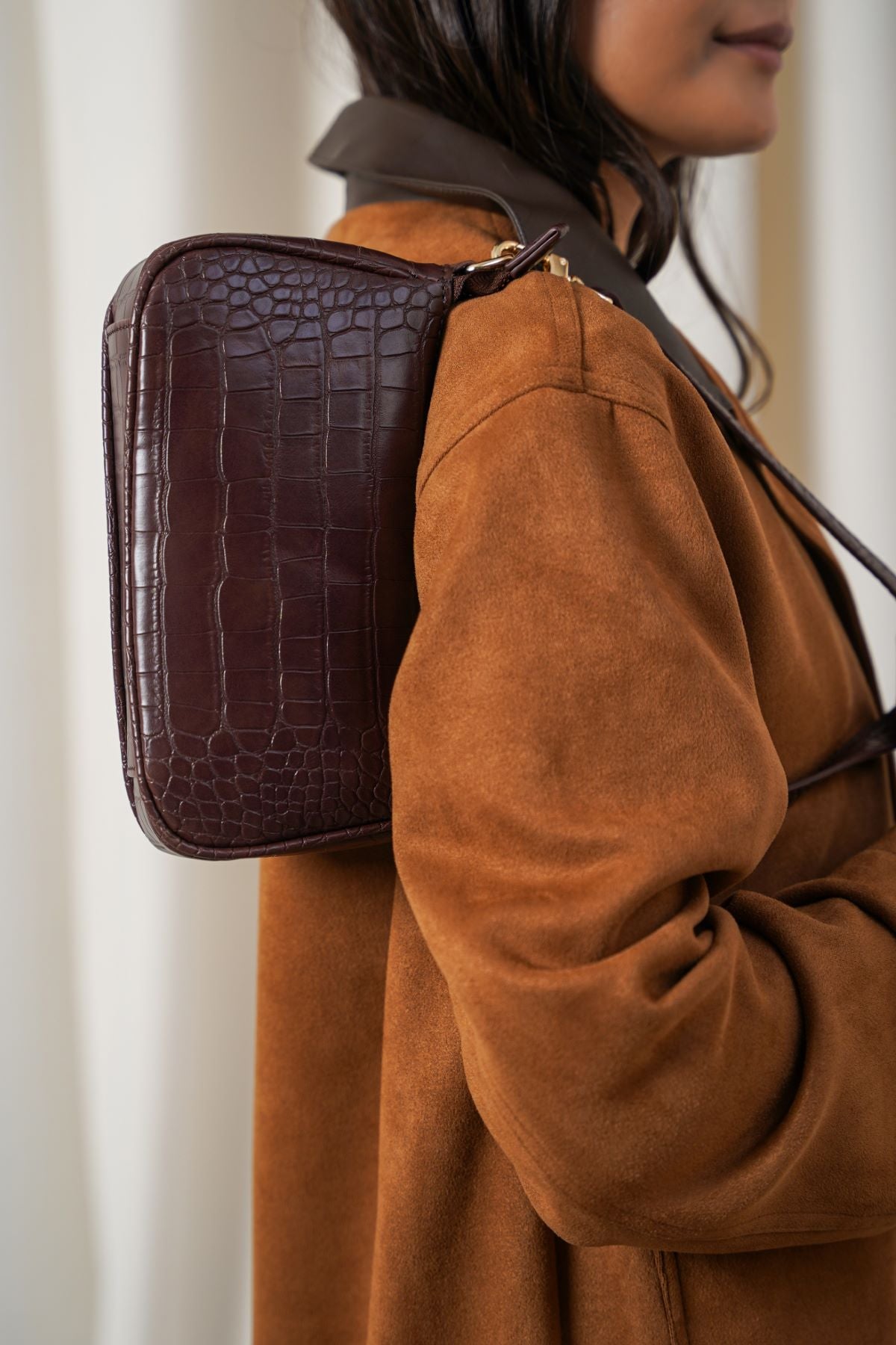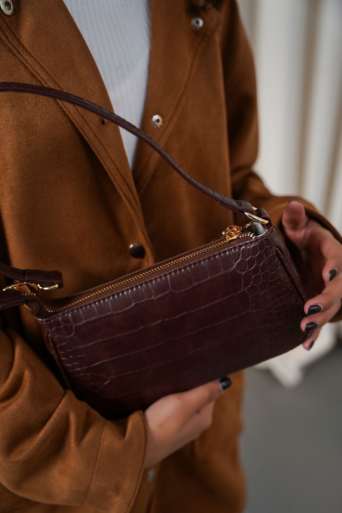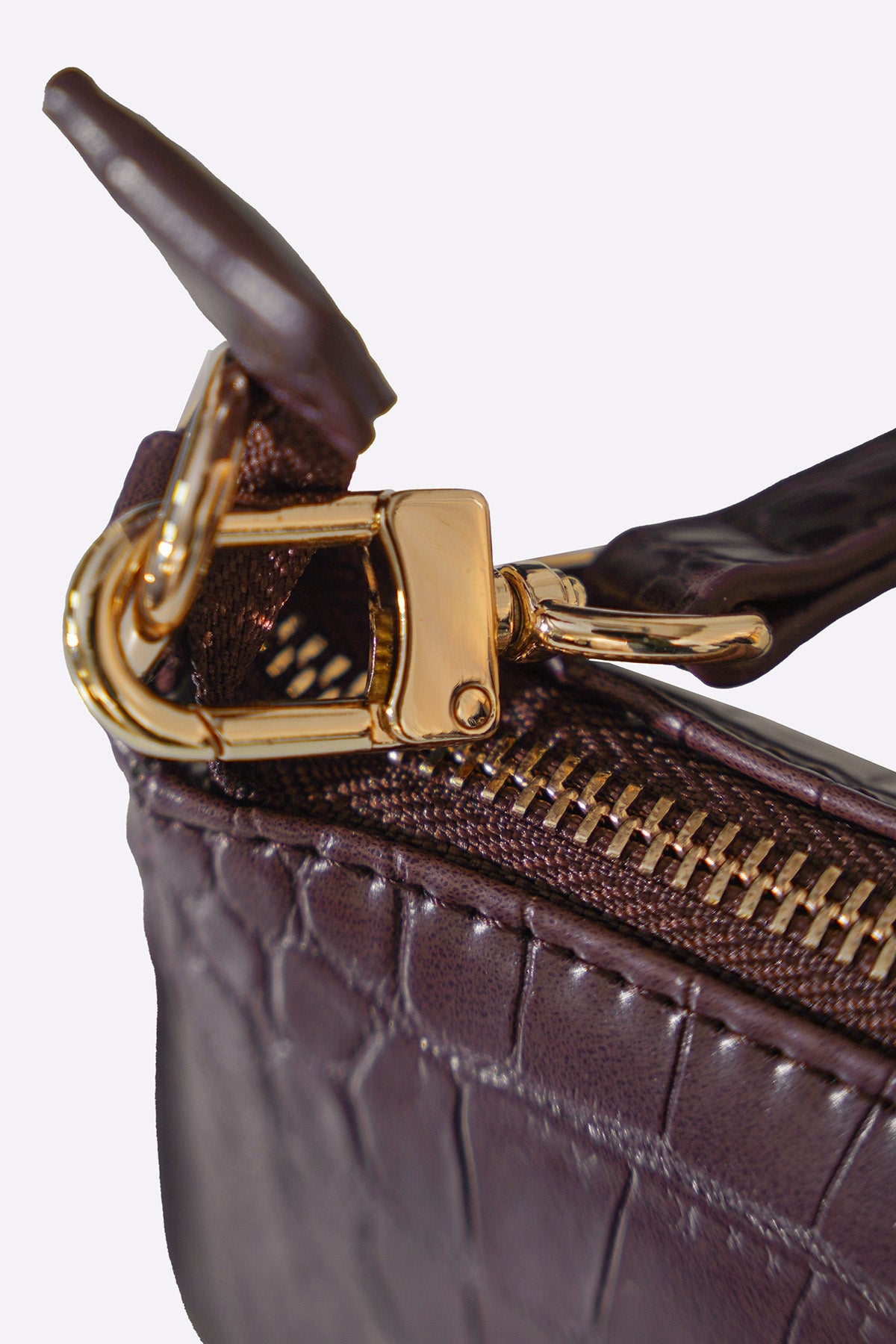Butter soft textured mini shoulder bag with a zip, gold accessories, and two inner pockets to hold your belongings.