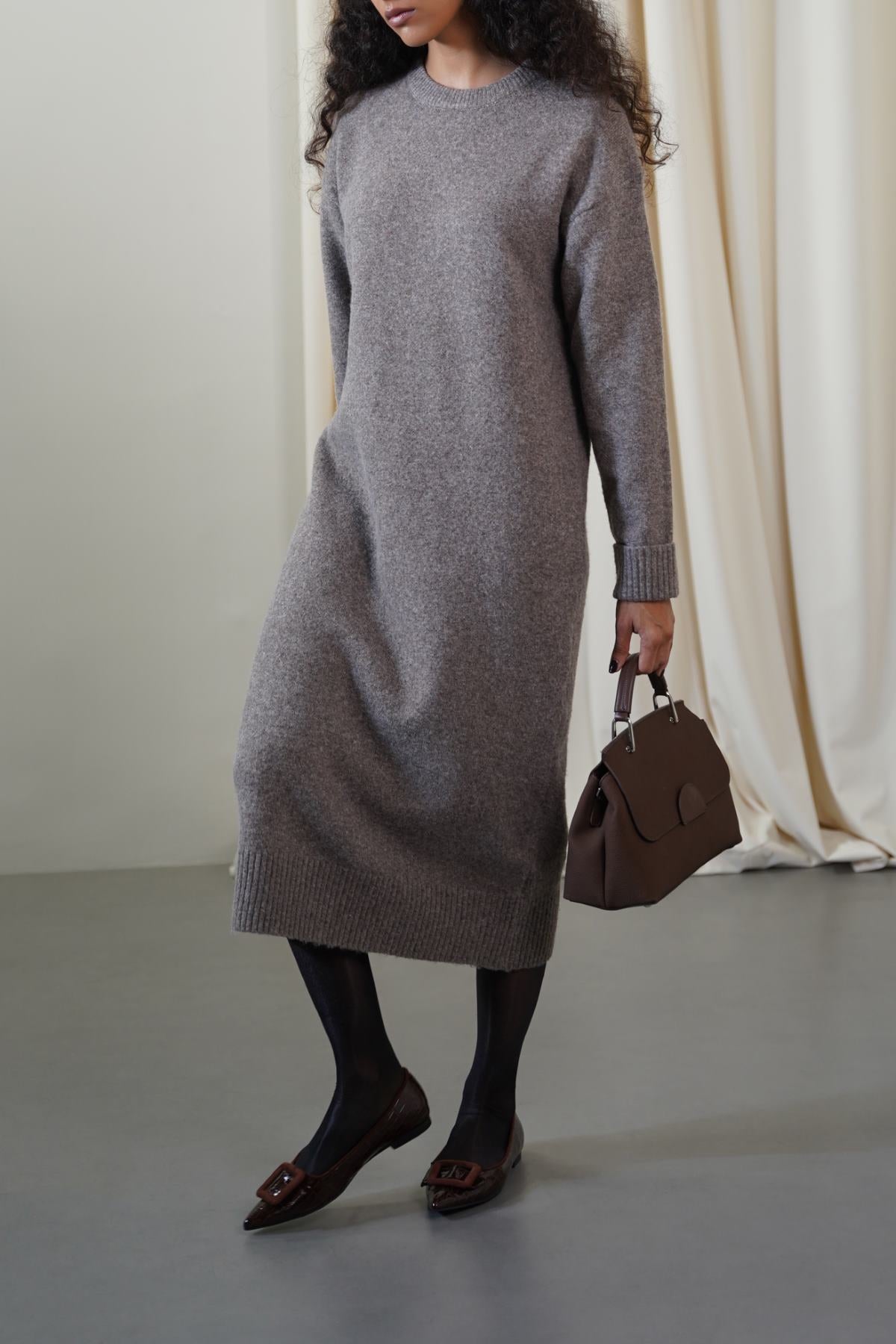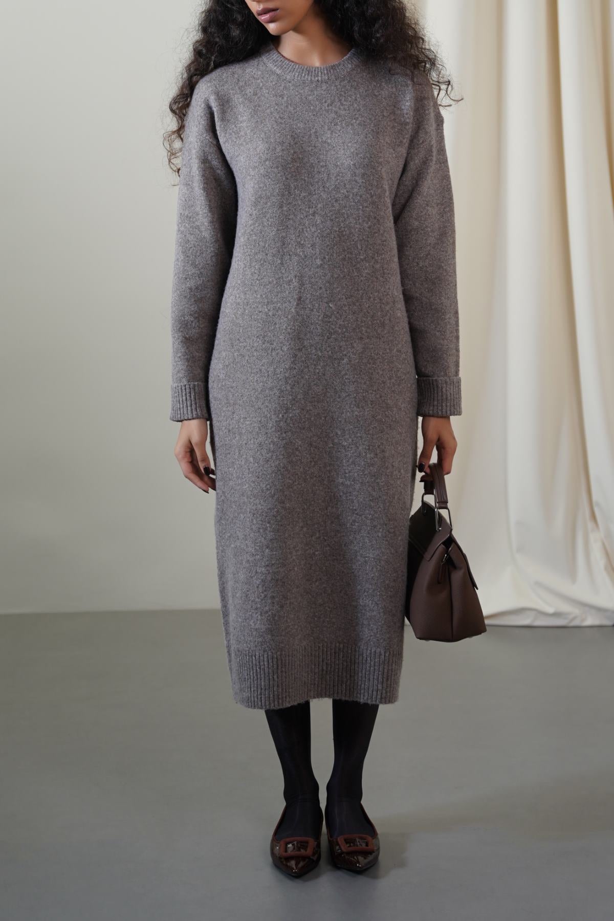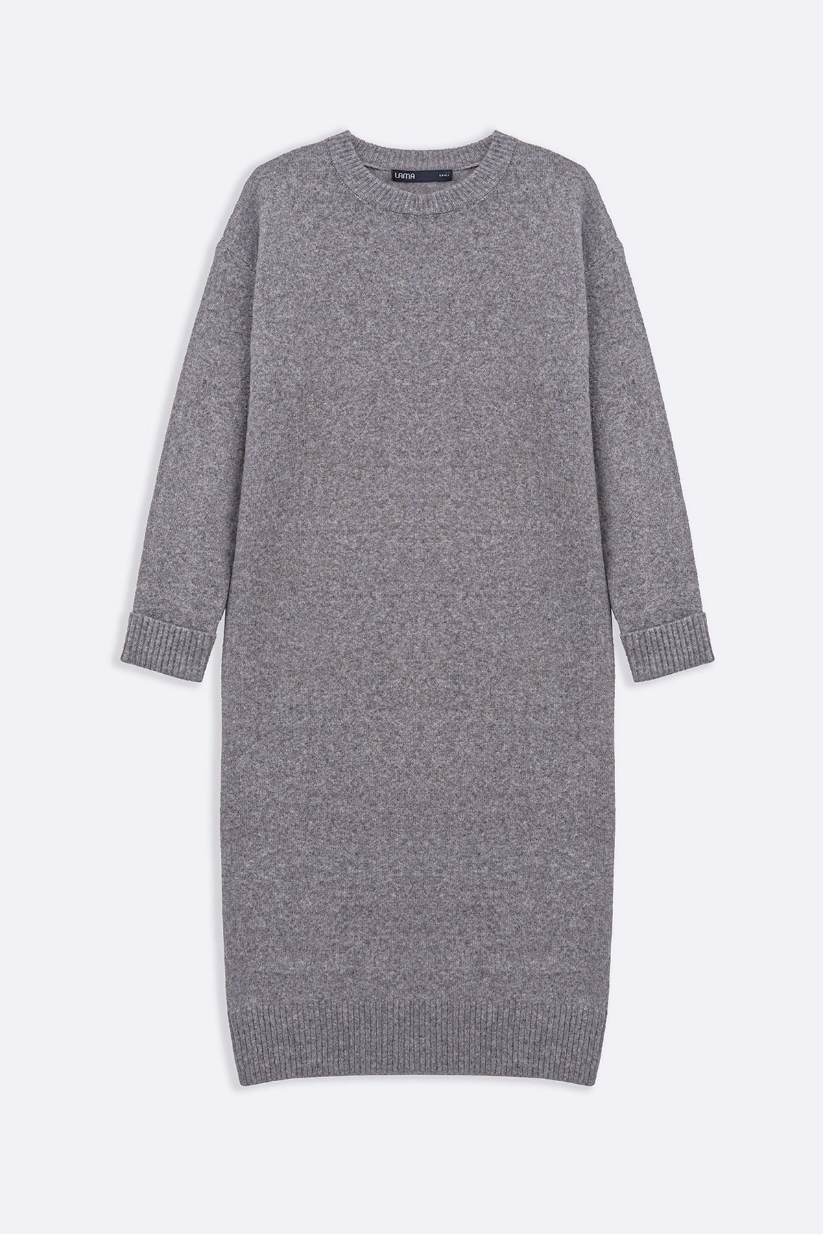 Design details: Crew neckline dress with long sleeves and rib detailing on hem, neck, and cuff.