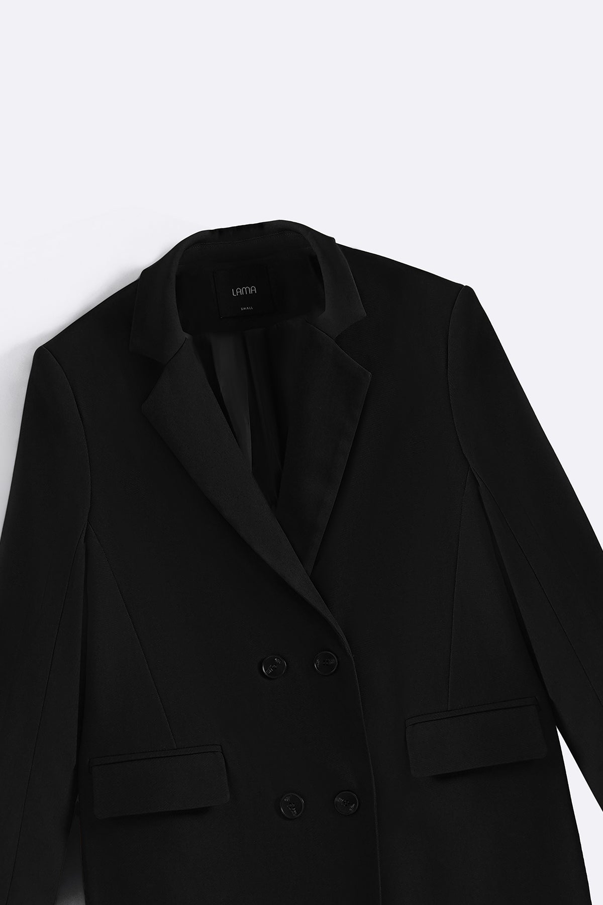 Design details: Long lapel collar blazer with double-breasted button fastening, front flap pockets and back vent detail
