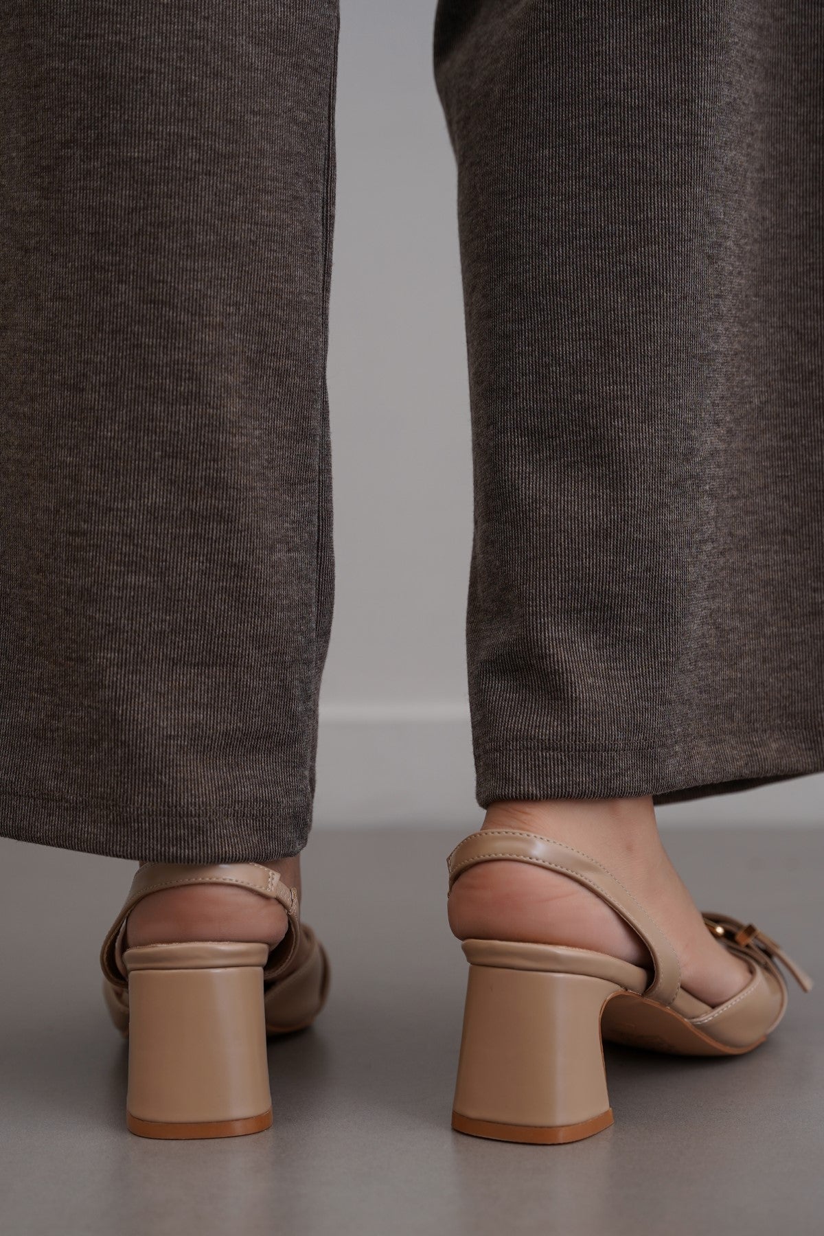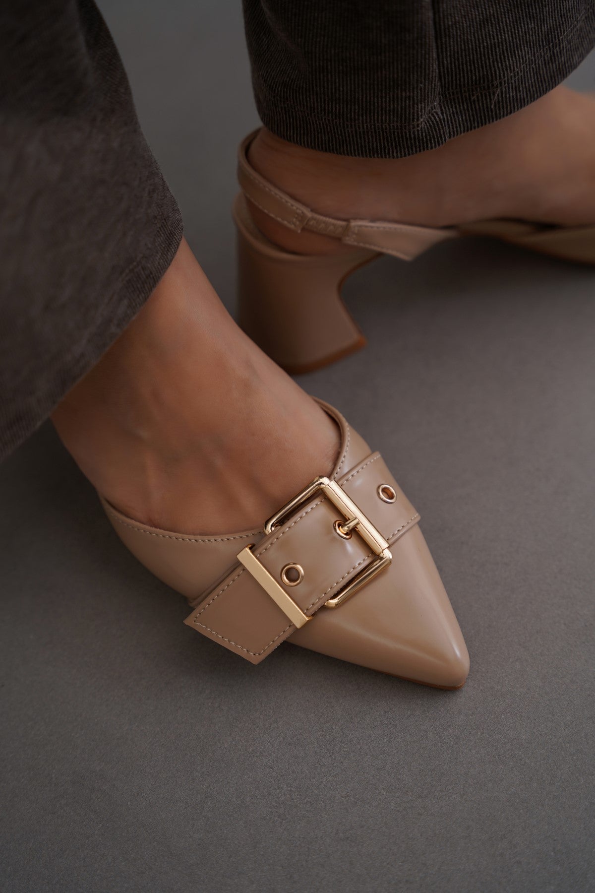 Pointy slingback block heels with gold buckle strap detail on the toe.