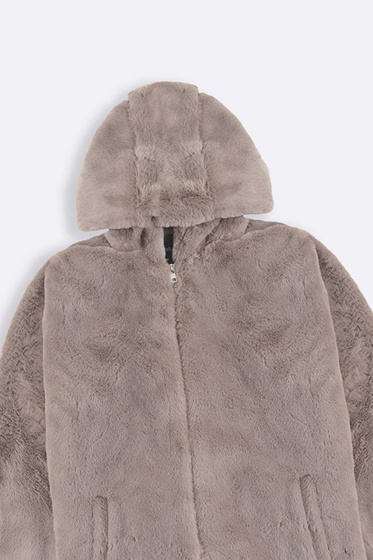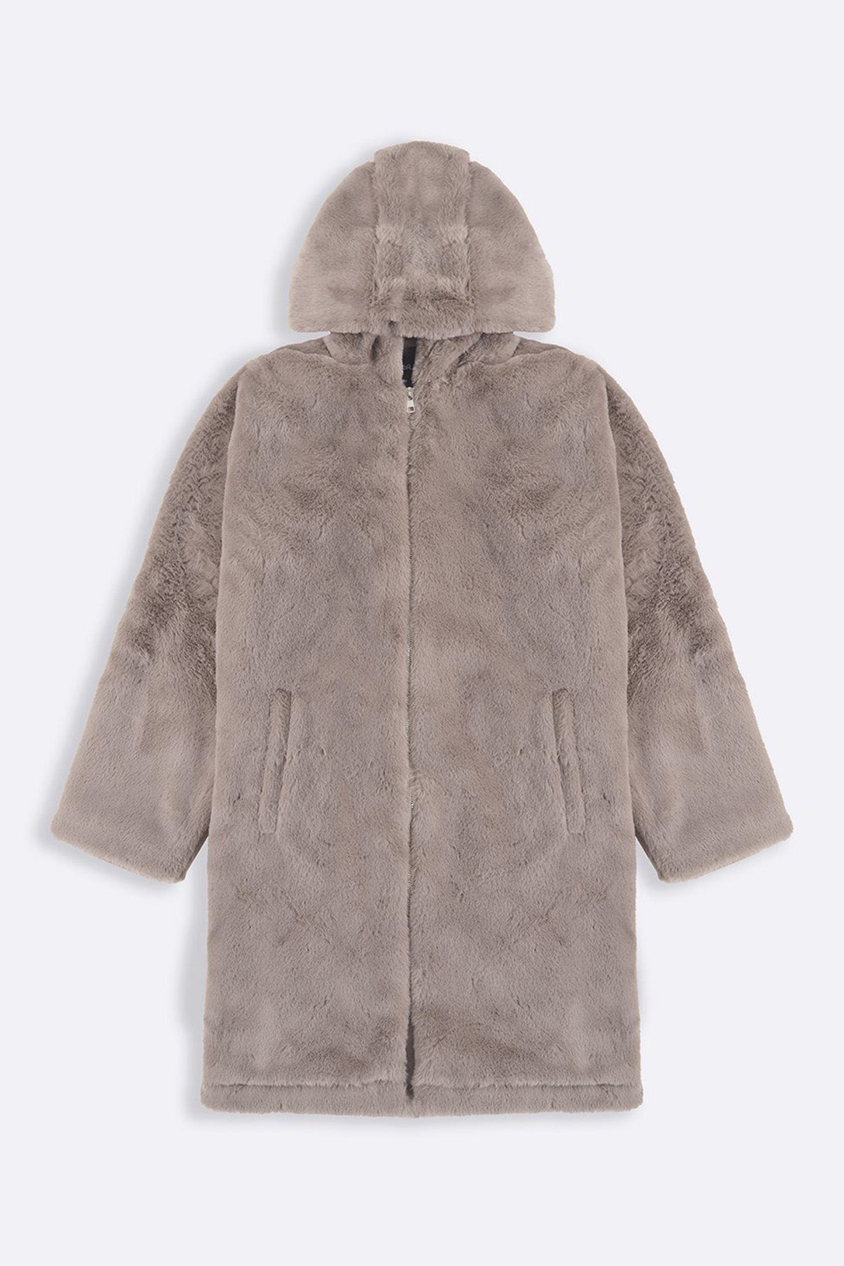 Design details: Long faux fur jacket with hood, front zip closure and side pockets.