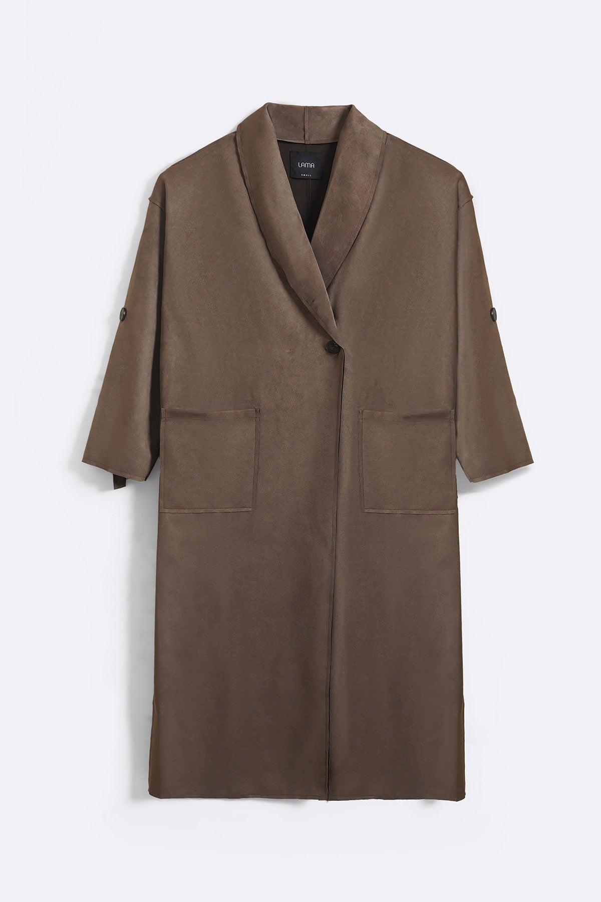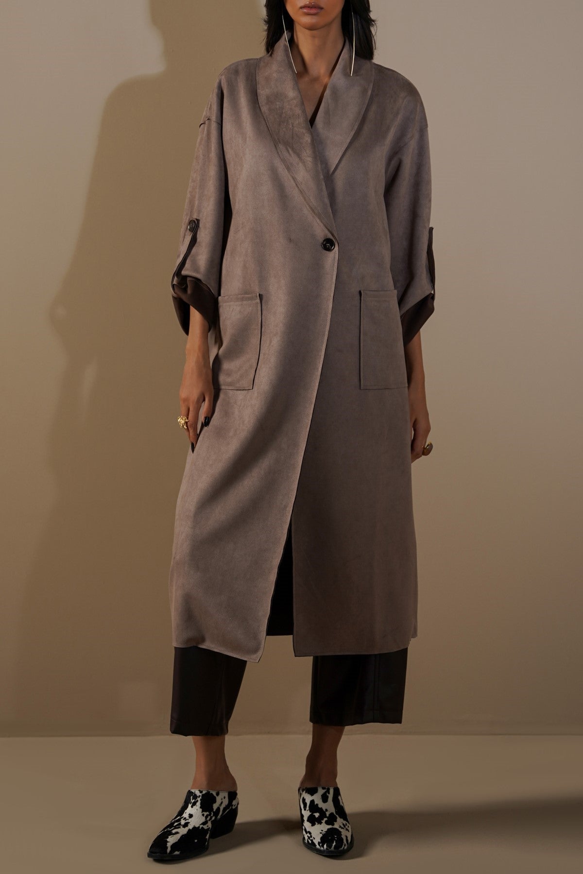 Design details: Long, tailored blazer in suede with a shawl collar, front patch pockets and turn up sleeve detail. It has a double breasted front button closure and back vent.