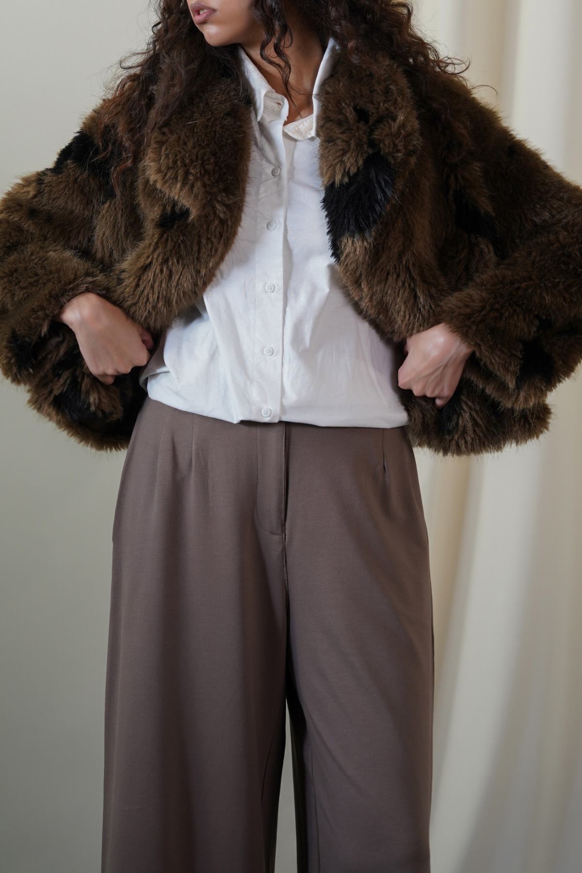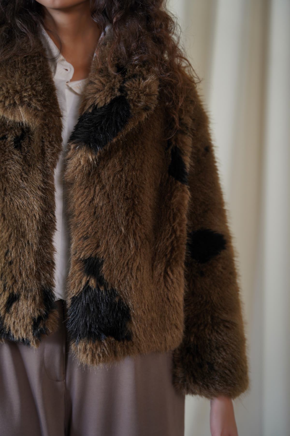 Design details: Cropped animal faux fur jacket with a wide collar and a concealed hook and eye closure.