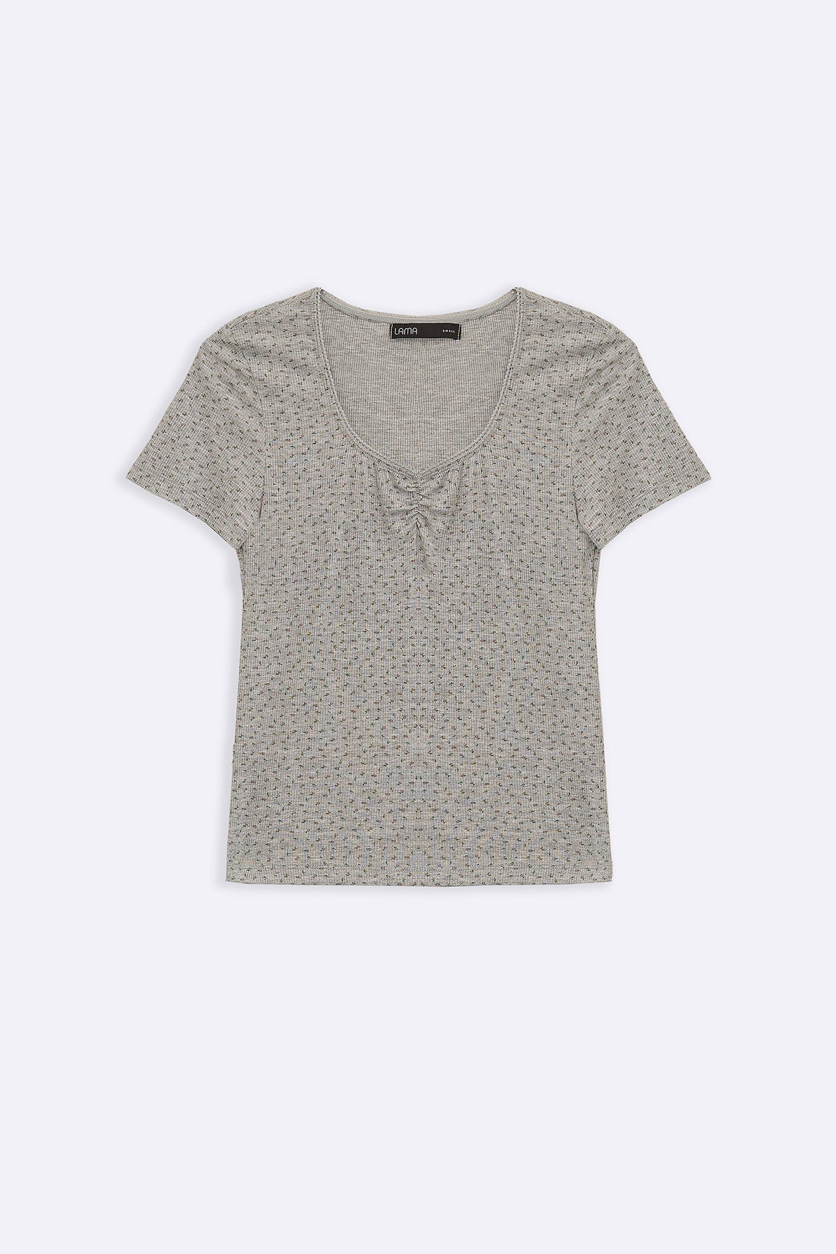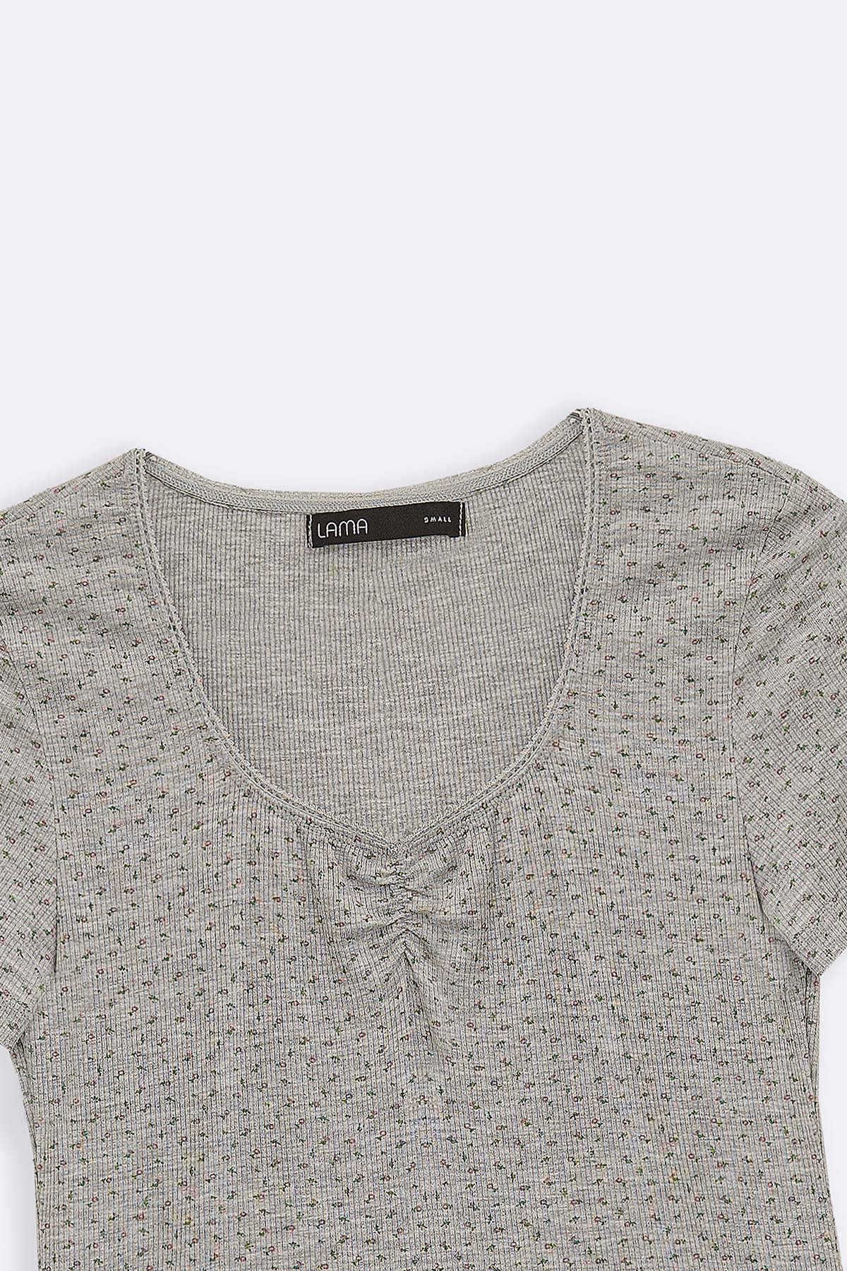 Design details: Laced sweetheart neckline with ruched details at the front, along with short sleeves and floral prints all over.