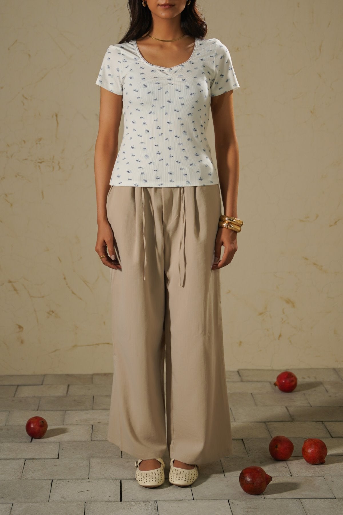 Design details: Laced sweetheart neckline with ruched details at the front, along with short sleeves and floral prints all over.
