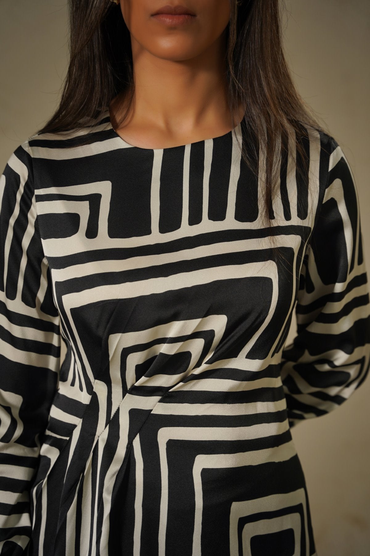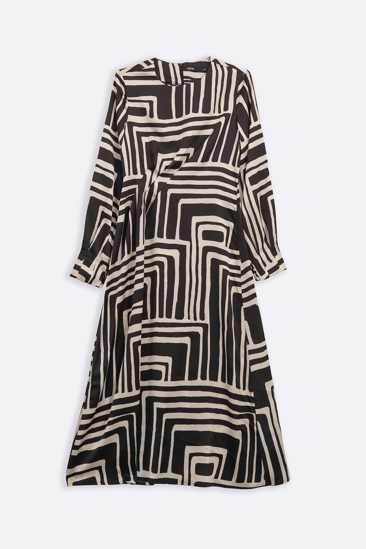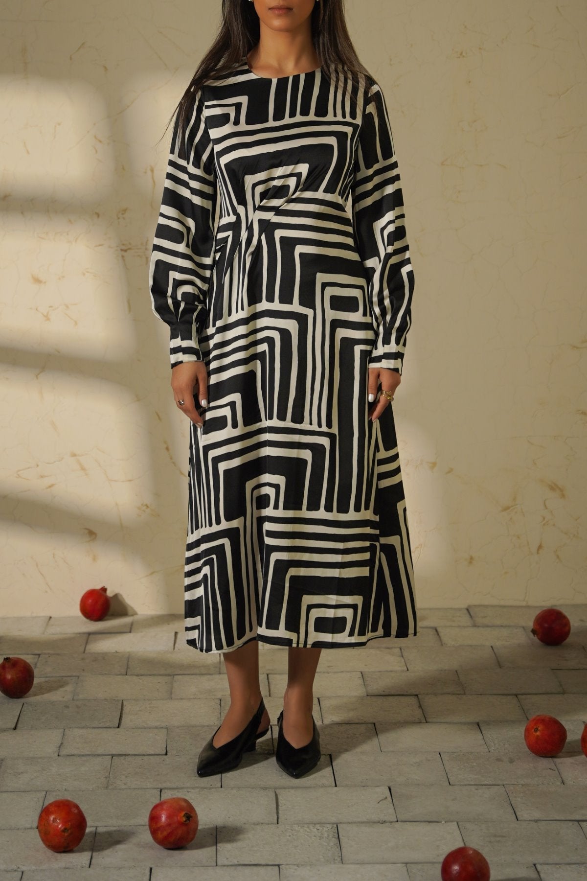Design details: Full length dress with a round neckline, long sleeves with cuff detailing, and pleats at waist for a cinched shape.