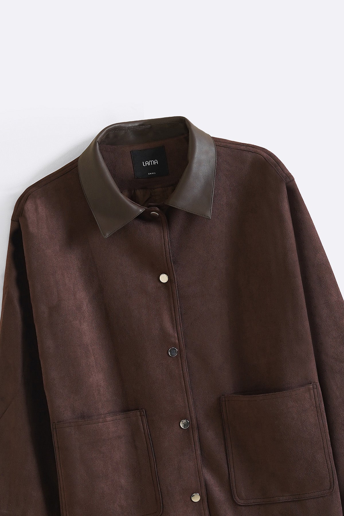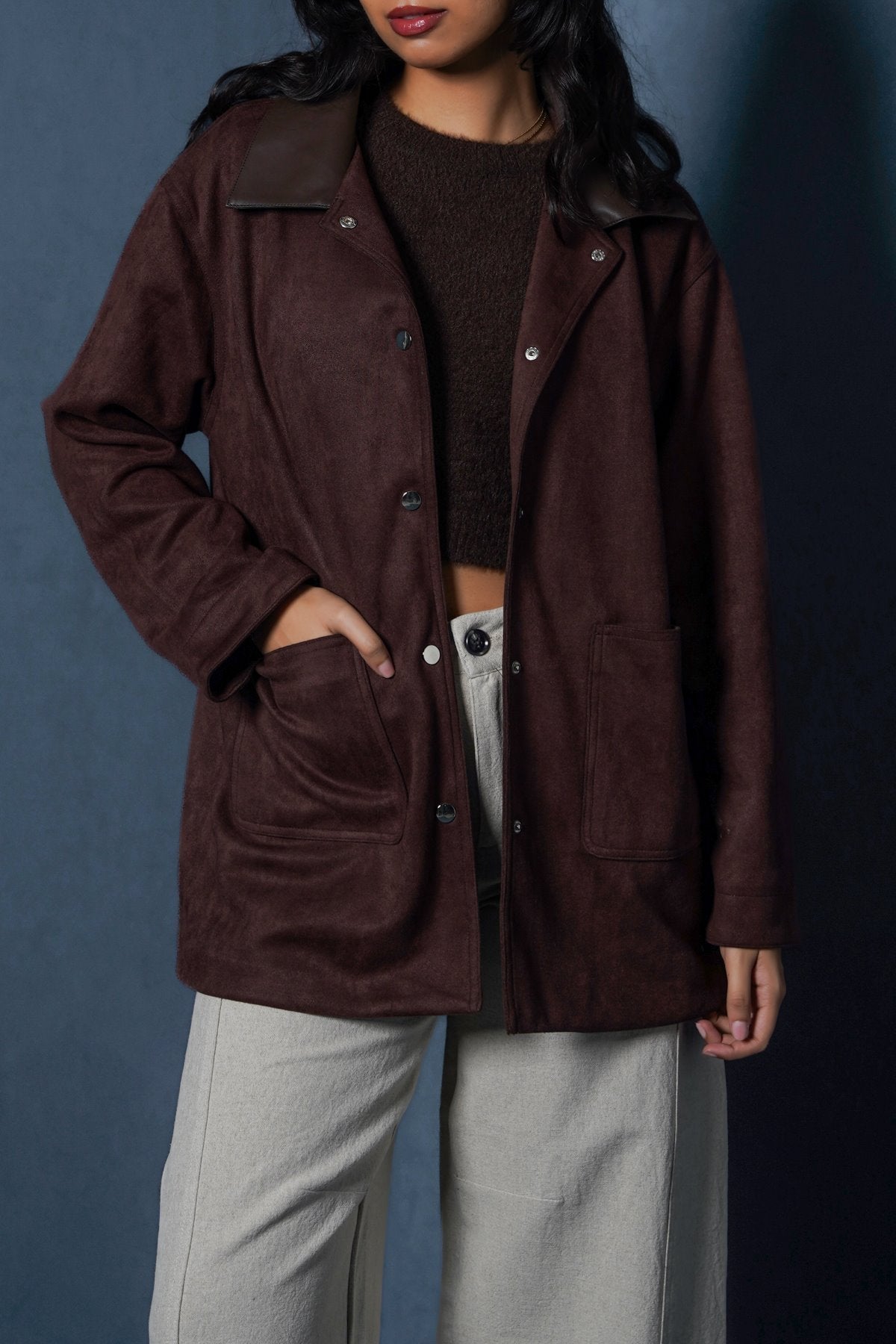 Design details: Suede jacket with PU collar, patch pockets and snap button front.