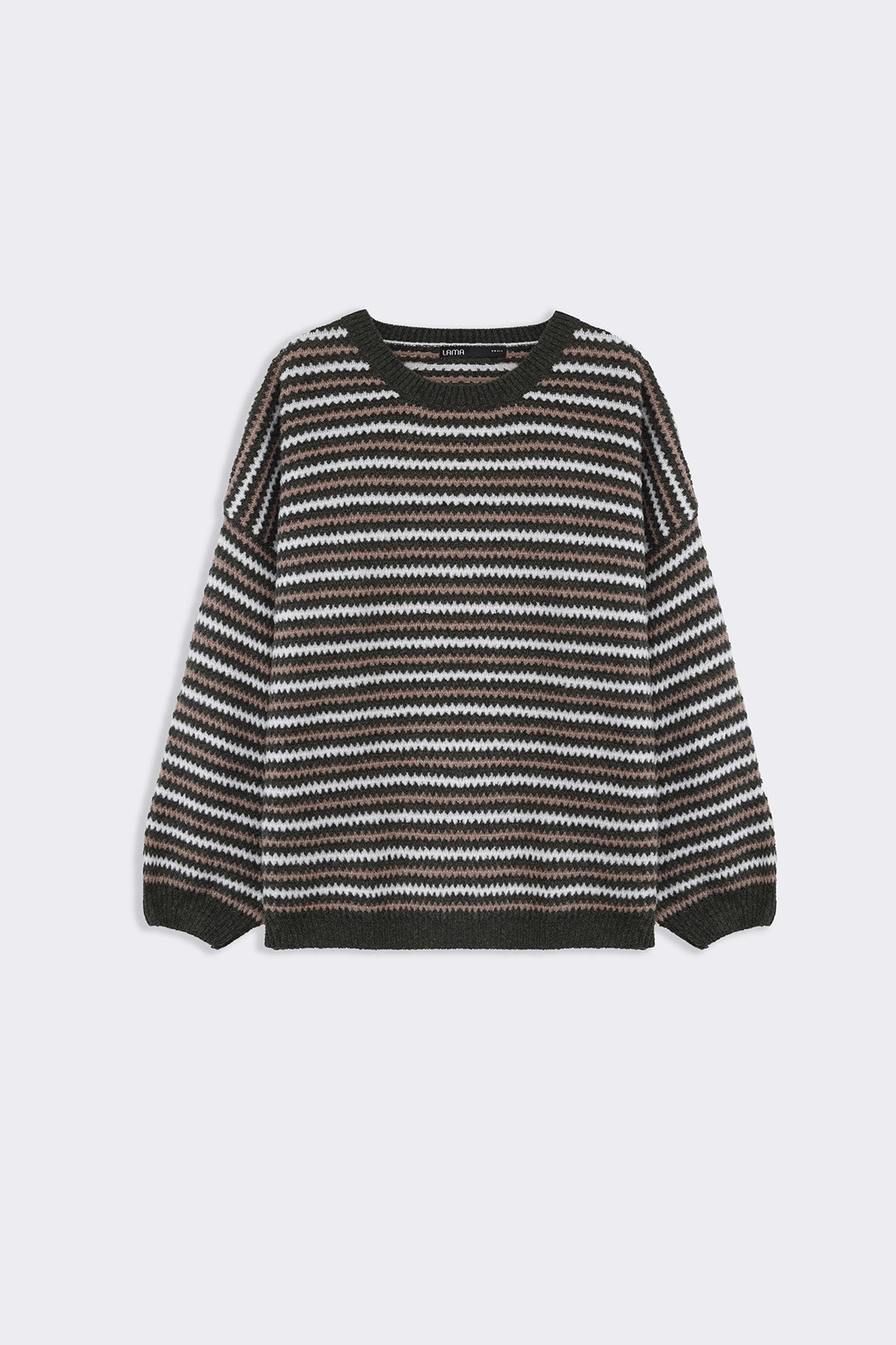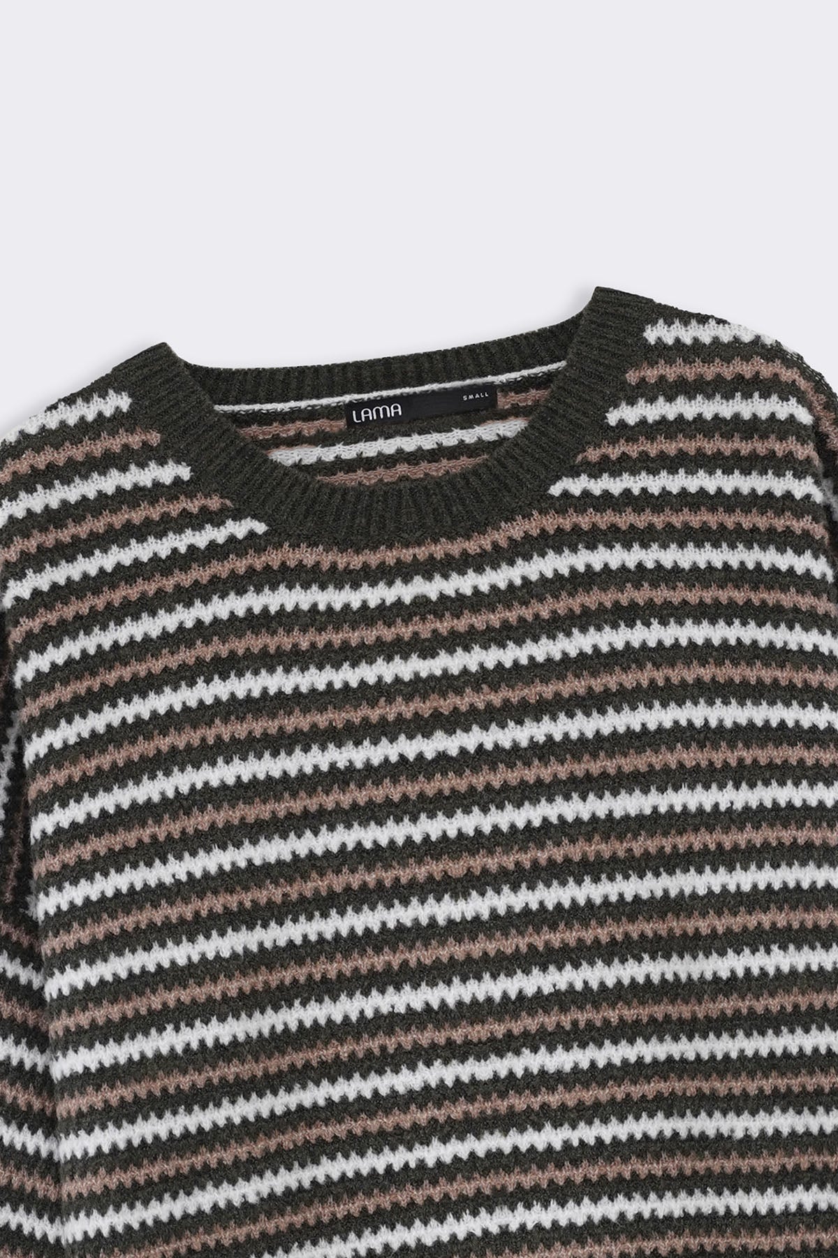 Design details: Crew neck sweater with a rhythmic stripe pattern throughout, and full sleeves.